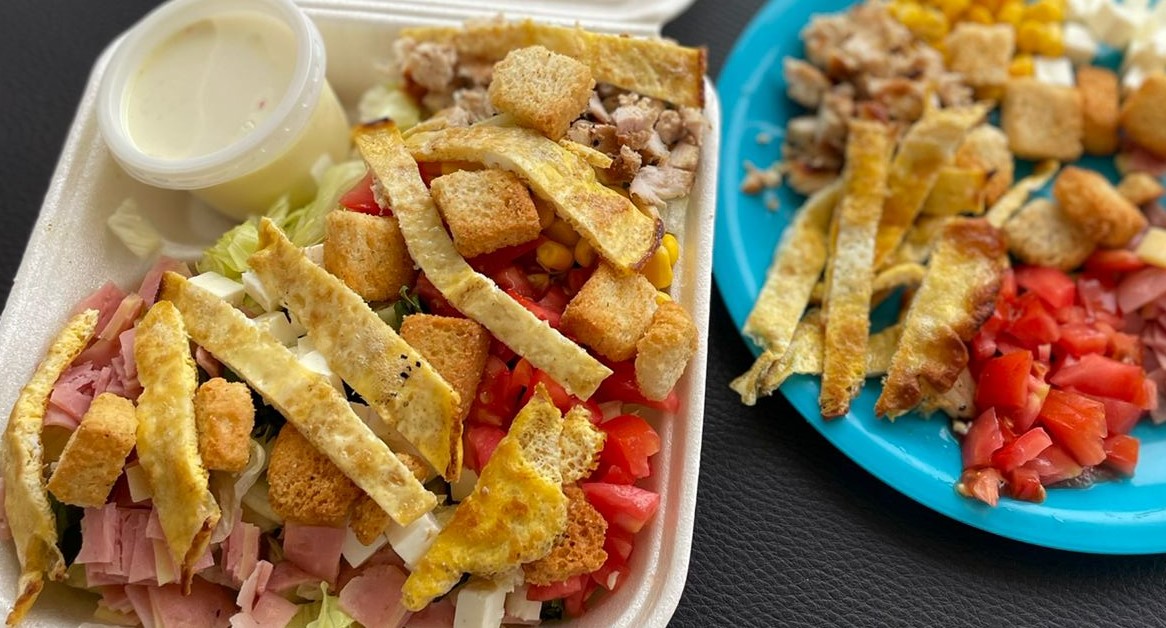 Mix de lechuga y espinaca, pollo a la plancha, queso manchego, jamón, elote, queso panela, tiras de huevo y crutones.