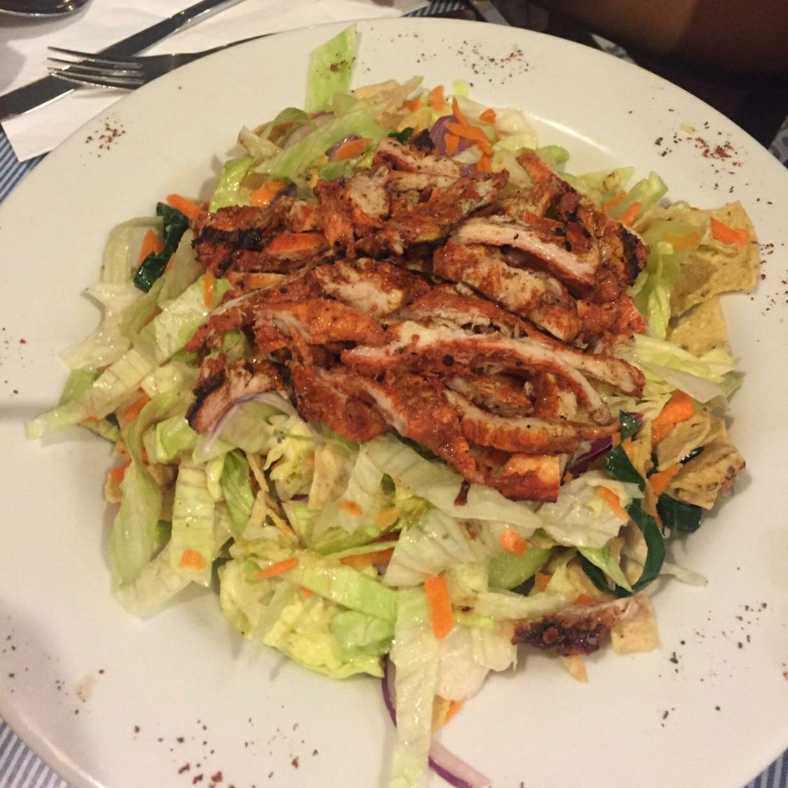 Mix de lechuga y espinaca, pollo empanizado, champiñones, huevo cocido, cebolla, tomate y crutones.