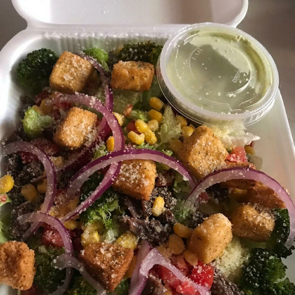 Mix de lechuga y espinaca, pollo a la plancha, brócoli, zanahoria rallada, pimiento morrón, queso panela y crutones.
