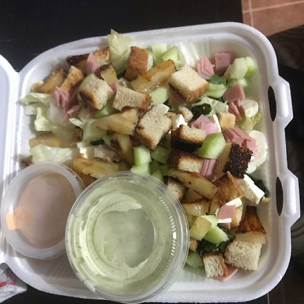 Mix de lechuga y espinaca, pollo a la plancha, piña asada, jamón, pepino, queso panela y crutones.