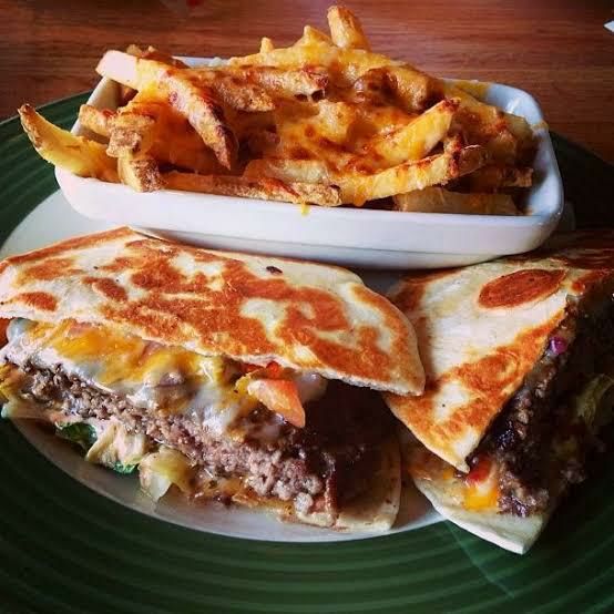 (3) Quesadilla de tortilla de harina con queso y media carne de hamburguesa. Con papas a la francesa(100gr).