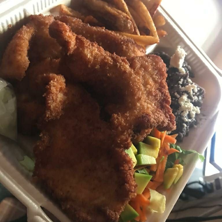 Bisteces de pollo, acompañado de frijol, lechuga con zanahoria, plátano frito, chile en rajas y tortilla de maiz.