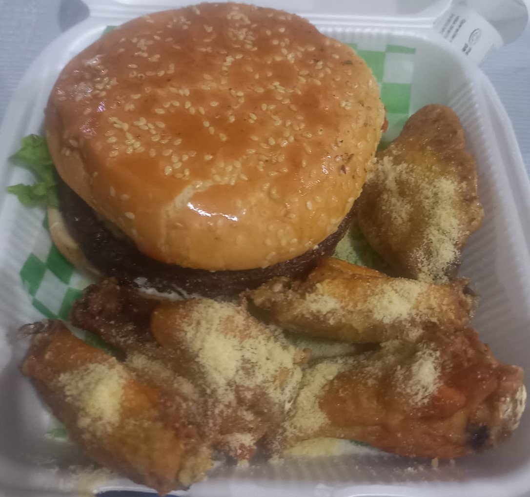 Una hamburguesa clásica, más 5 alitas bañadas en la salsa de tu preferencia, 1 oz de dip ranch (no incluye vegetales)
