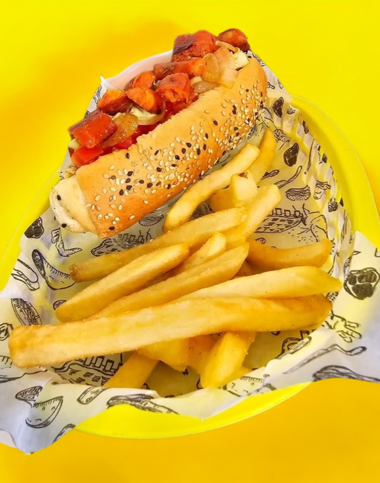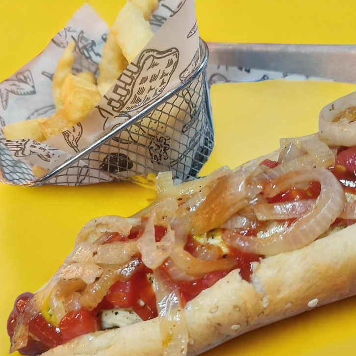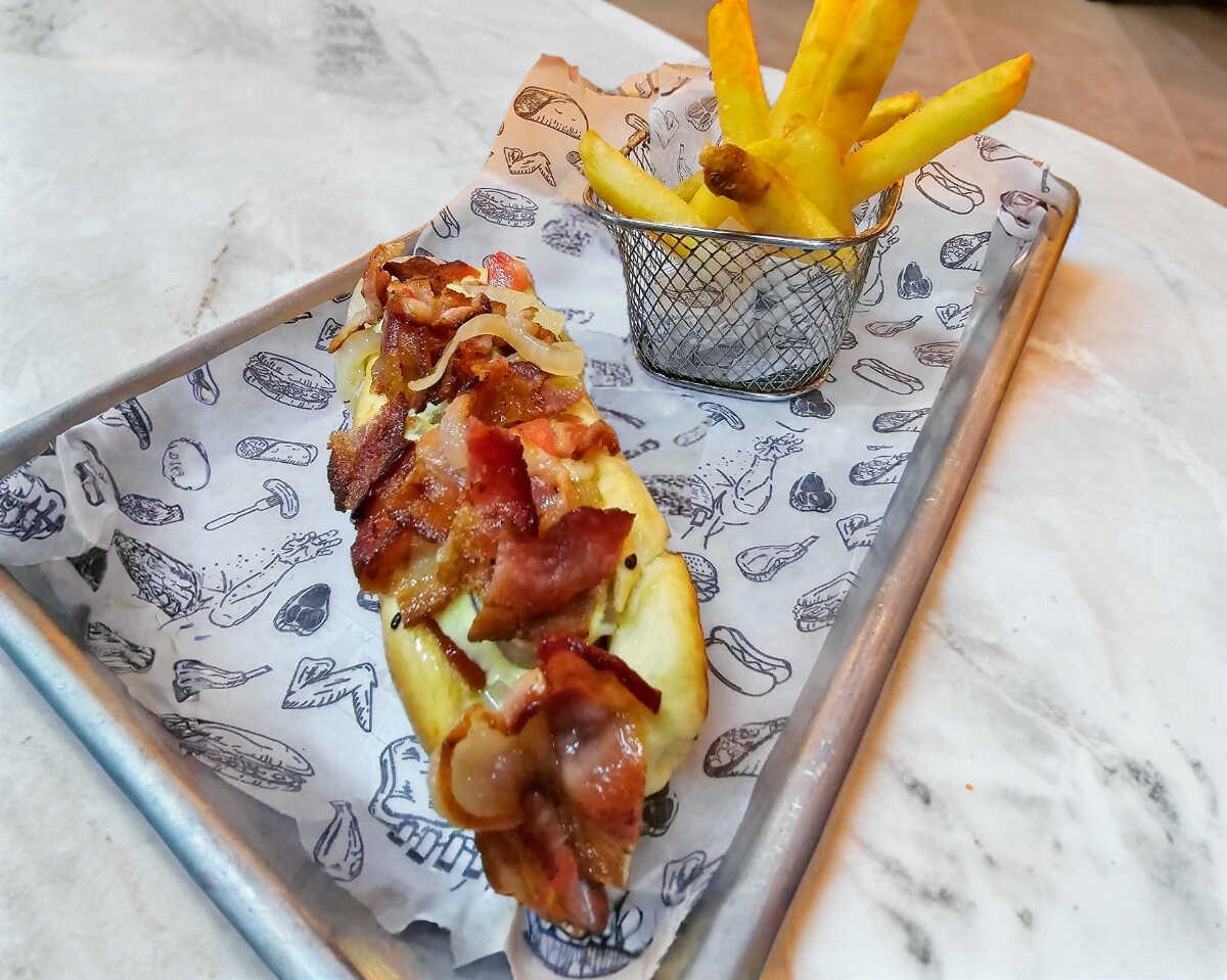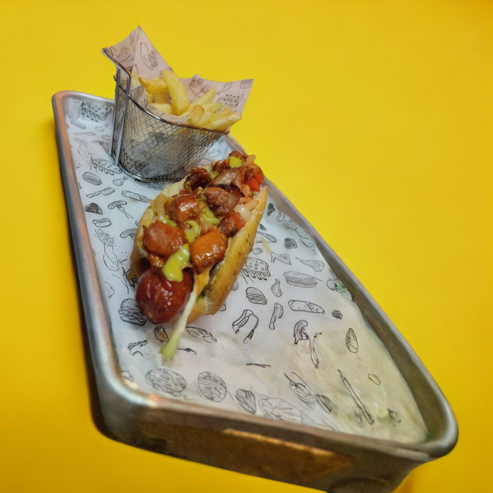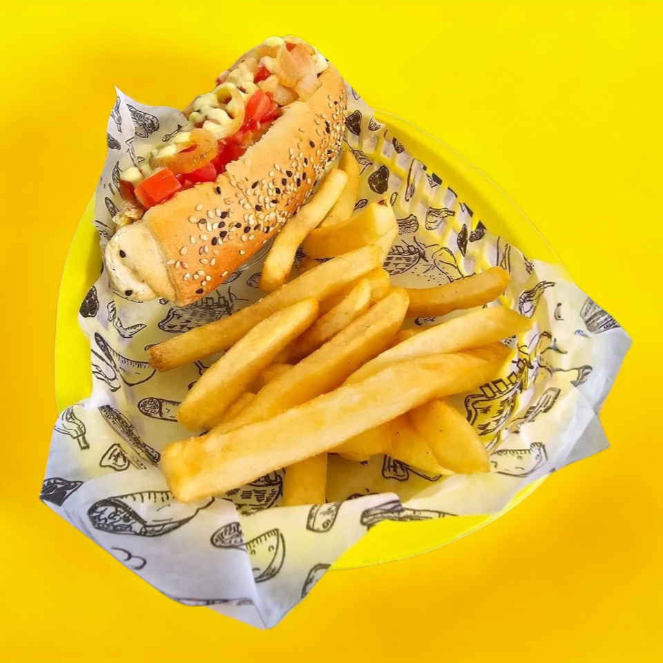 Pan artesanal, salchicha de res asada, queso Oaxaca gratinado, aderezo de la casa, tomate y cebolla asada, aderezo verde y tocino crujiente. acompañado de papas a la francesa.