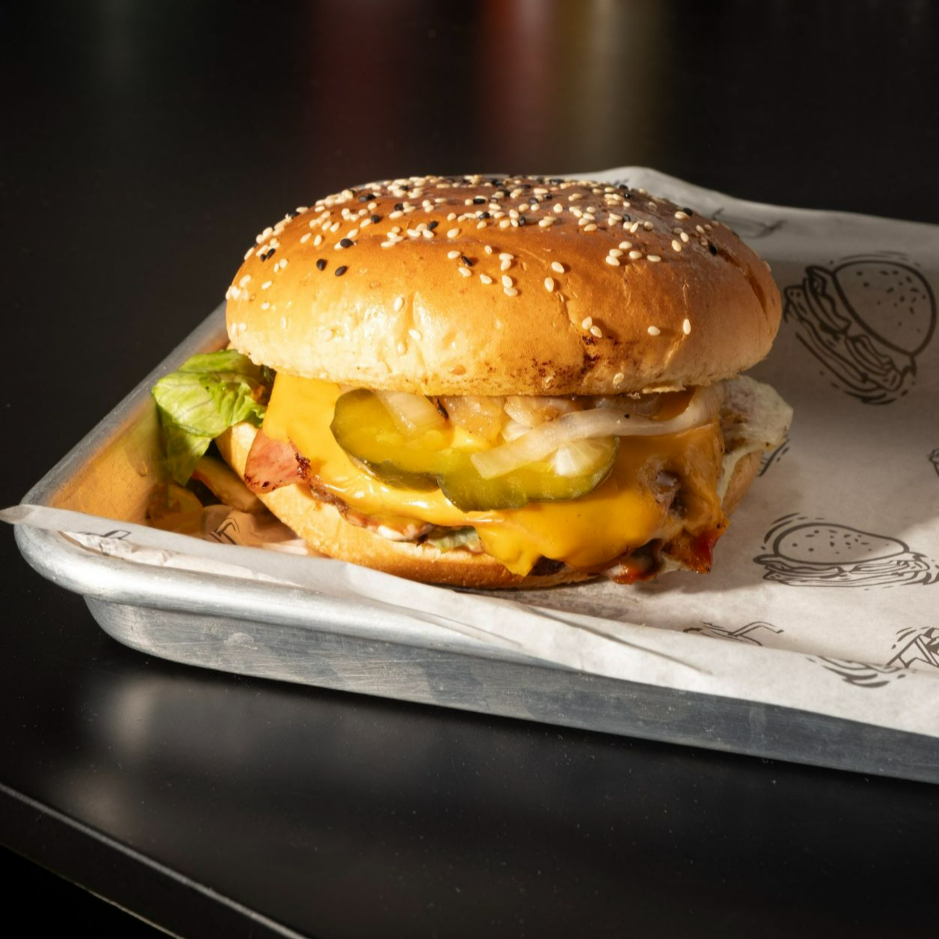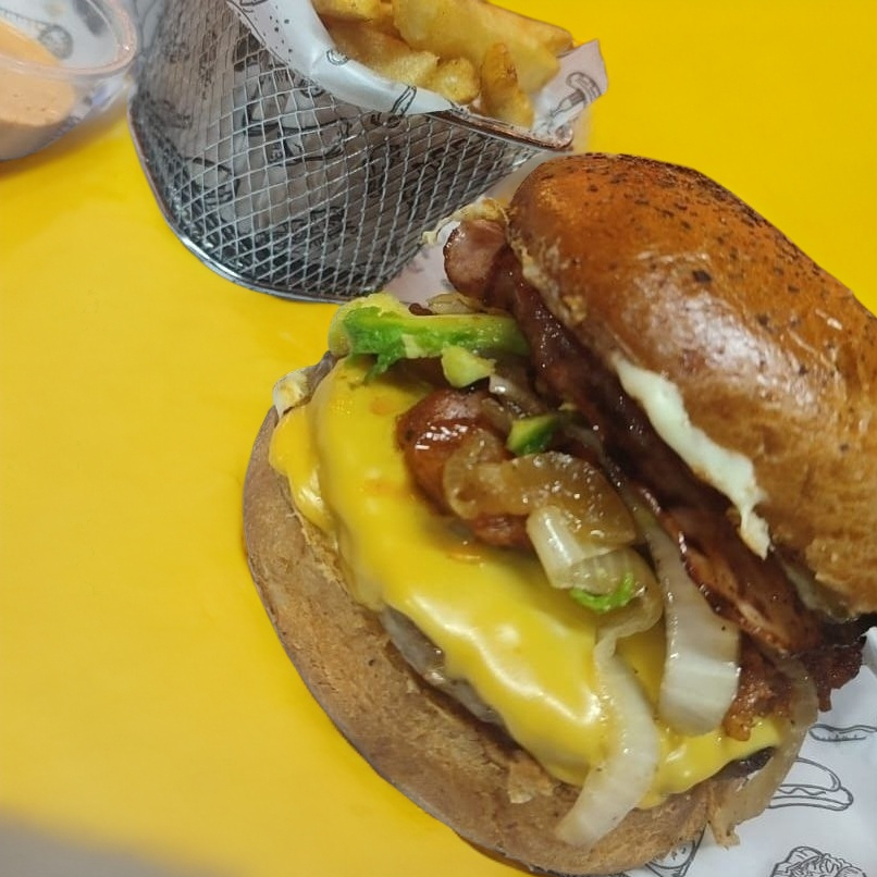 Hamburguesa carne casera 130gr con cebolla asada y crujiente tocino, queso americano y Oaxaca gratinado, verduras lechuga, tomate, pepinillos, aderezo de la casa, acompañada de papas a la francesa.