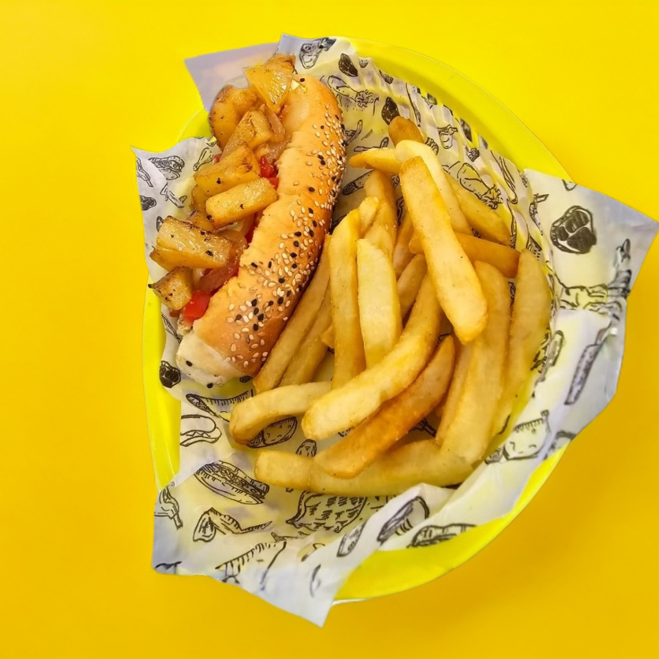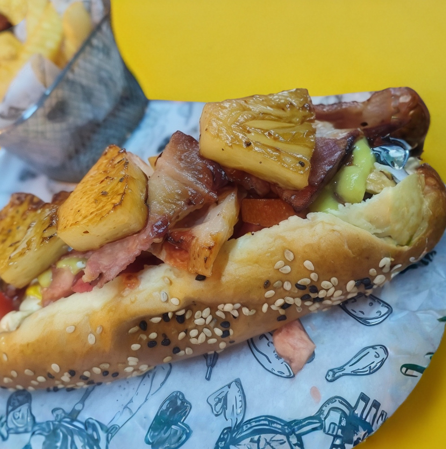 Pan artesanal, salchicha de res asada, queso Oaxaca gratinado, aderezo de la casa, tomate y cebolla asada, aderezo verde y piña asada en trozos. acompañado de papas a la francesa.