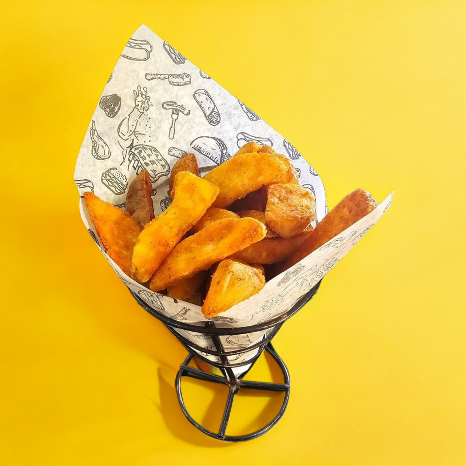 Crujientes papas gajo naturales o lemón PPR, acompañadas de queso amarillo y chimichurri.