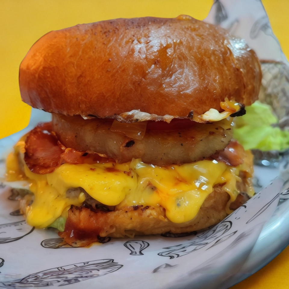 Hamburguesa carne casera 130gr con cebolla y piña asada, queso americano y Oaxaca gratinado, verduras lechuga, tomate, pepinillos, aderezo de la casa, acompañada de papas a la francesa.