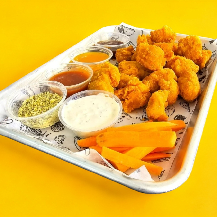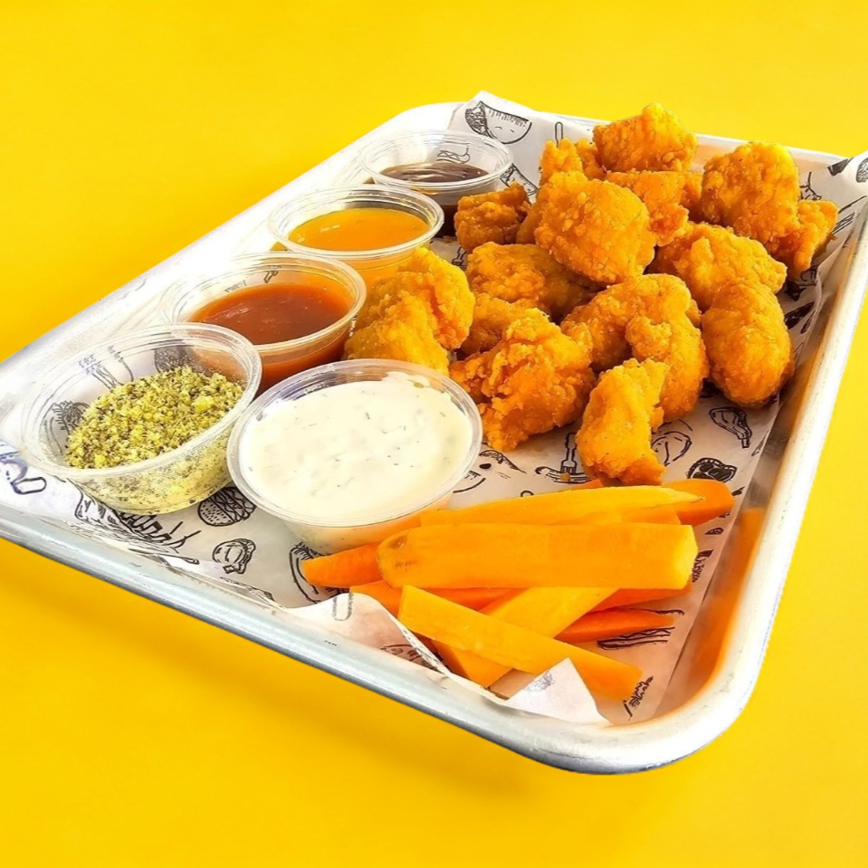 1/2 kg de crujientes boneles, puedes elegir hasta 2 salsas. Acompañada de aderezo ranch y 100gr de papa a la francesa.