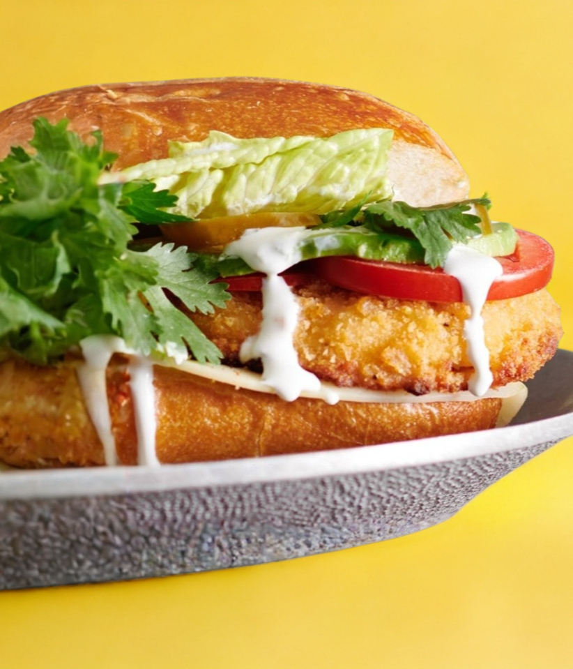 Crujiente pechuga de pollo empanizada, tomate, lechuga, aguacate y queso de Oaxaca gratinado. acompañada de papas a la francesa
