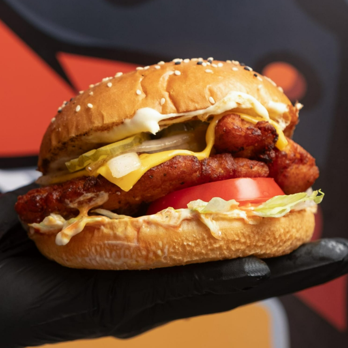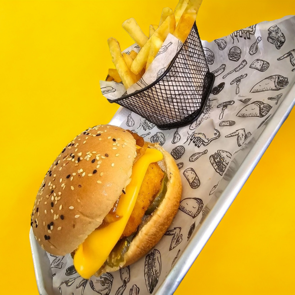 Hamburguesa crispy Chicken tender de pollo empanizado, queso amarillo, queso Oaxaca gratinado, aderezo de la casa, cebolla asada, tomate y lechuga más papas a la francesa.