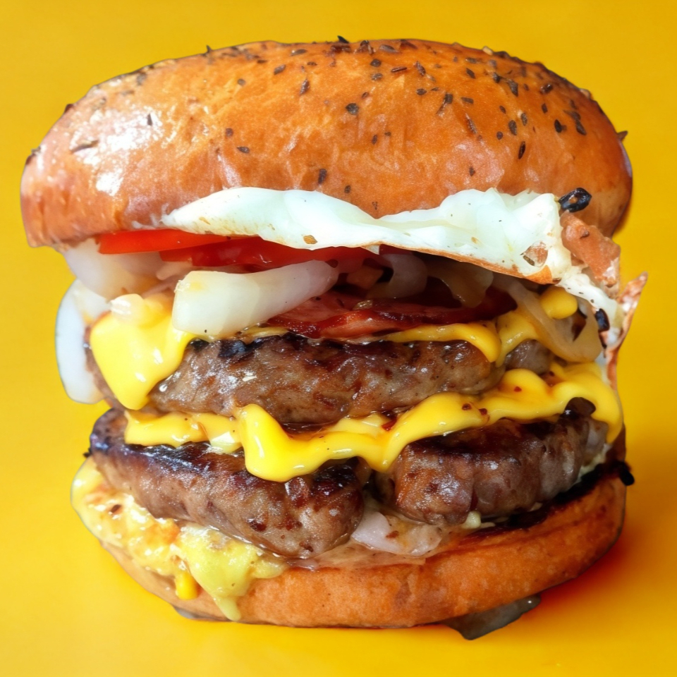 Doble carne casera (260) gr, doble queso americano, Oaxaca gratinado, tomate, cebolla asada, lechuga, pepinillos , aderezos de la casa y papas a la francesa.