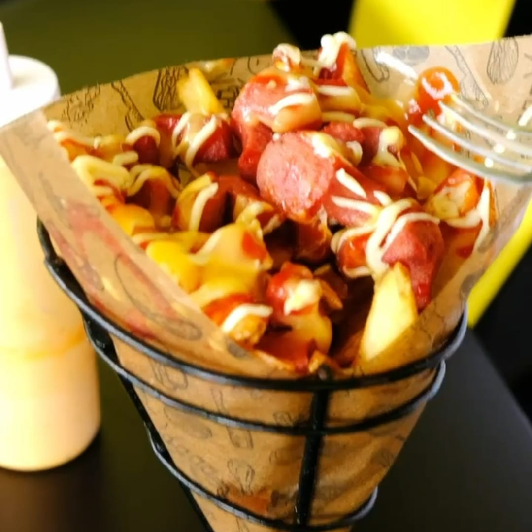 Delicias papas crujientes con pulpitos de salchichas fritas, adrezadas con cátsup, queso amarillo y mayonesa.