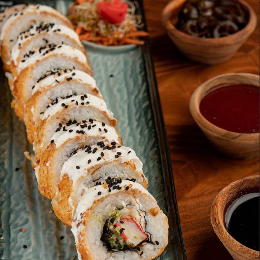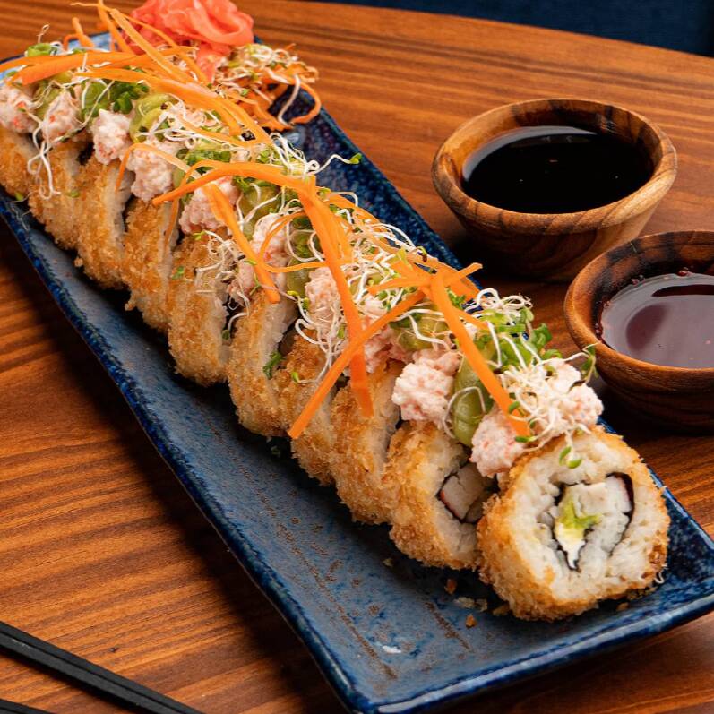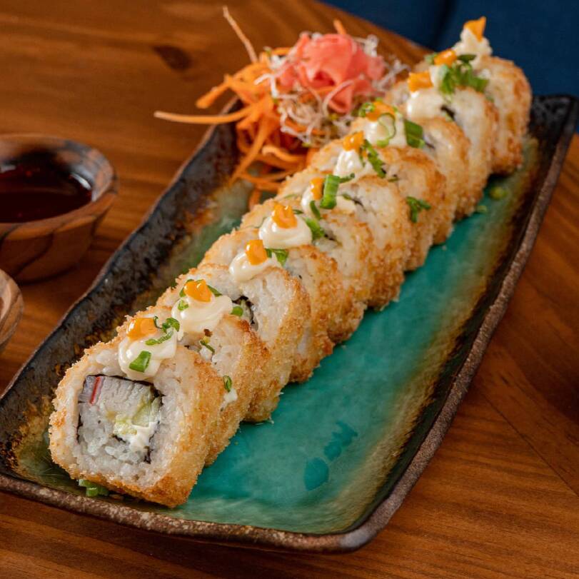 Por fuera: Empanizado, tampico, salsa de anguila. Por dentro: surimi y aguacate.