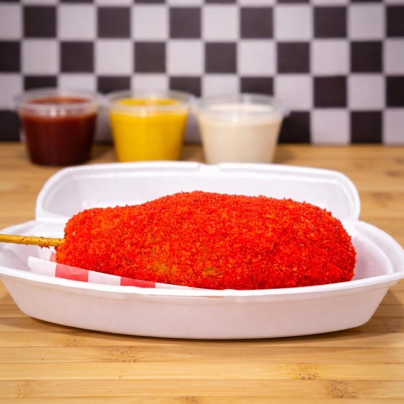 Banderilla estilo coreano tradicional,cubierta con una capa de chetos flaming hot,relleno a elección atraves de chat puede ser,Relleno de queso,salchichas,o mixta a elección,incluye cátsup.