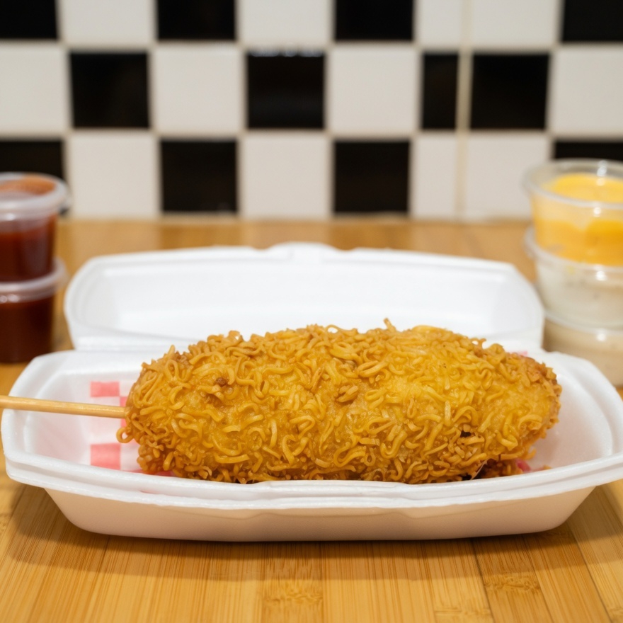 Banderilla estilo coreano tradicional,con pedazos de maruchan fritos encima,relleno a elección atraves de chat puede ser,Relleno de queso,salchichas,o mixta a elección,incluye cátsup.