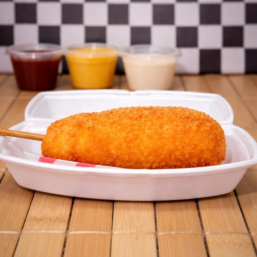 Banderilla estilo coreano tradicional,cubierta de trocitos de boneless,relleno a elección atraves de chat puede ser,Relleno de queso,salchichas,o mixta a elección,incluye cátsup.