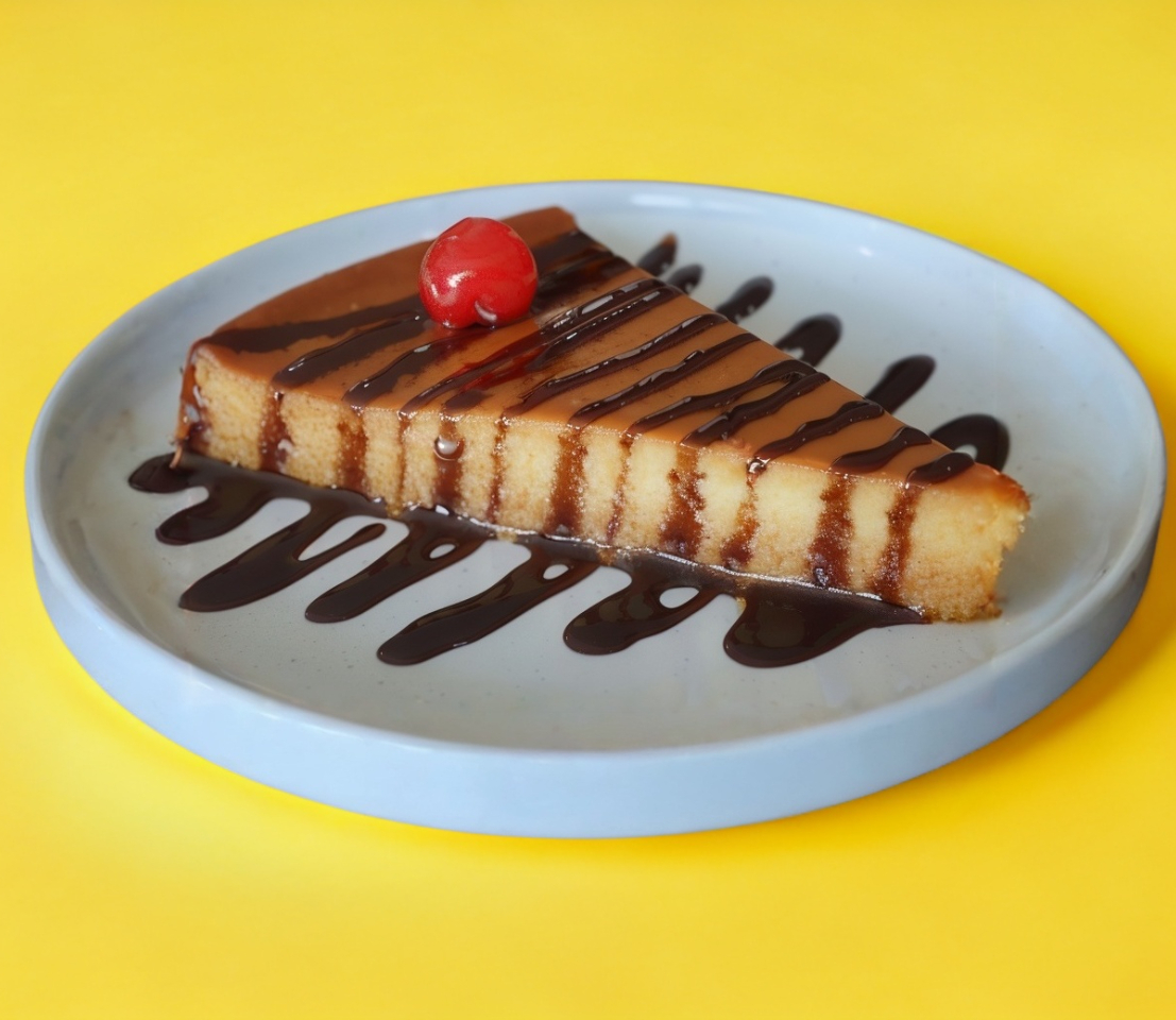 Flan de queso crema bañado en chocolate líquido y cereza.