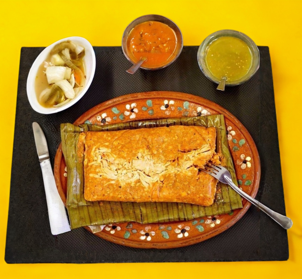 Tamal estilo huasteco, maíz quebrado con carne de cerdo, acompañado de chiles en vinagre.