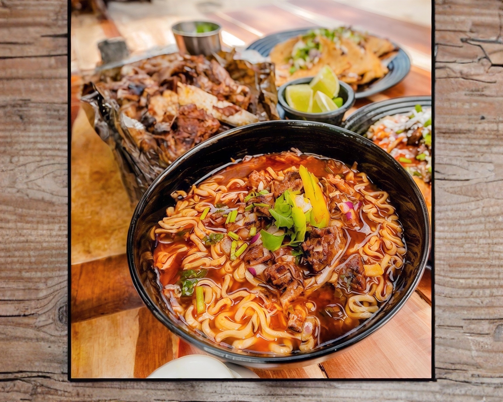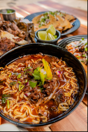 Ramen con caldo de birria y carne de barbacoa, cebollita con cilantro y aguacate