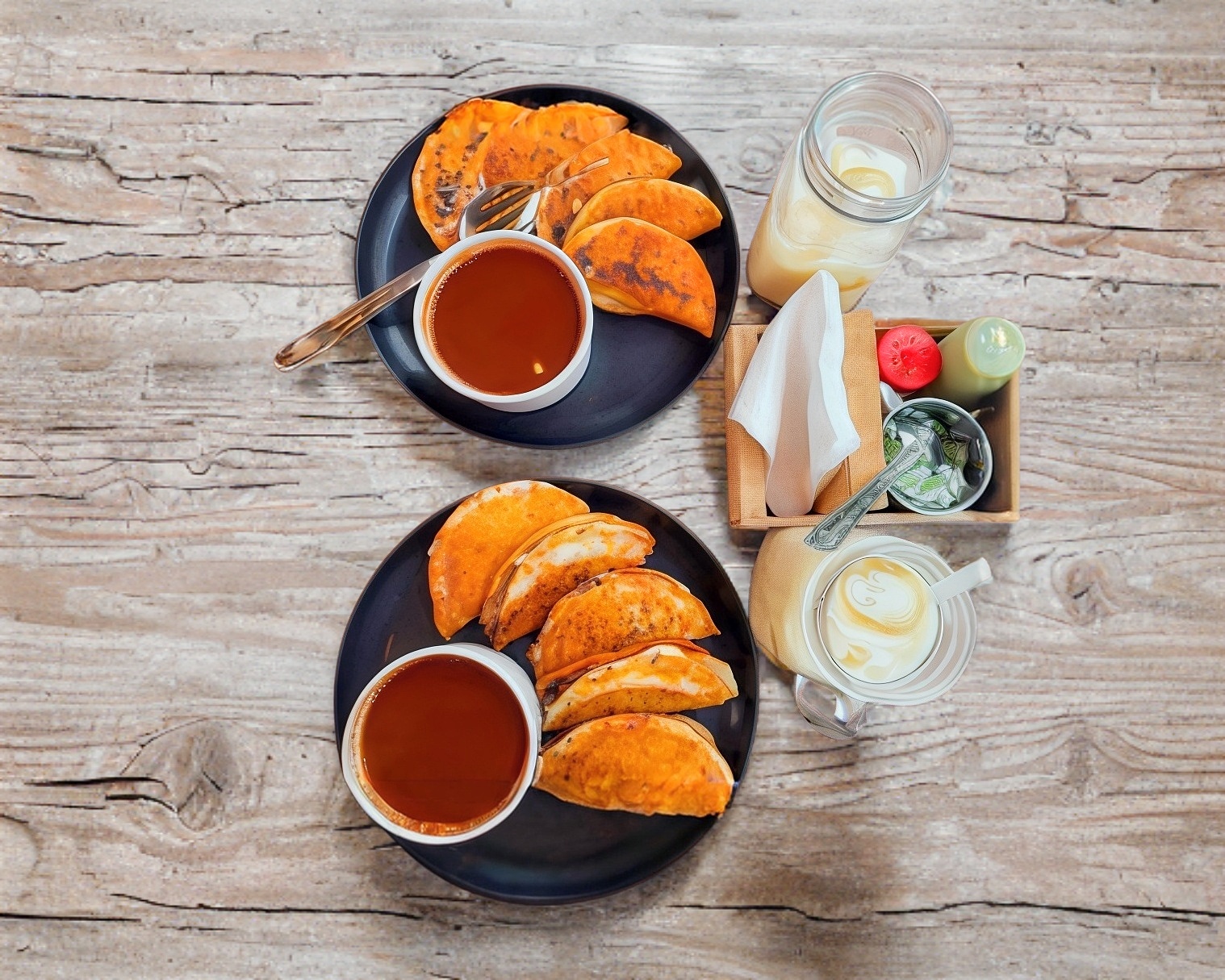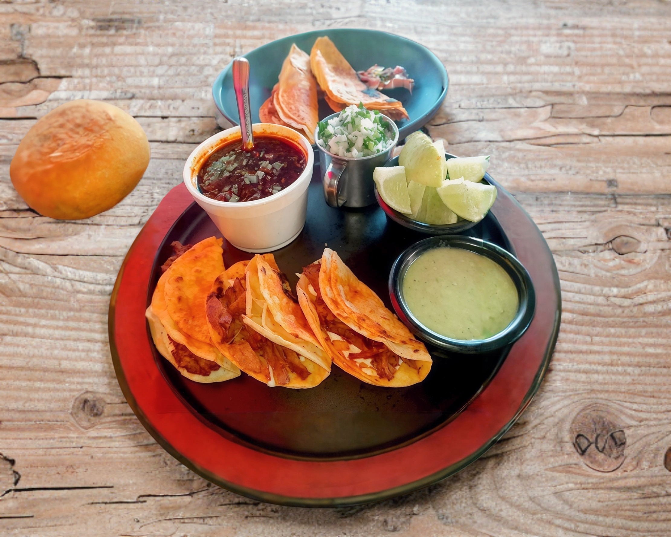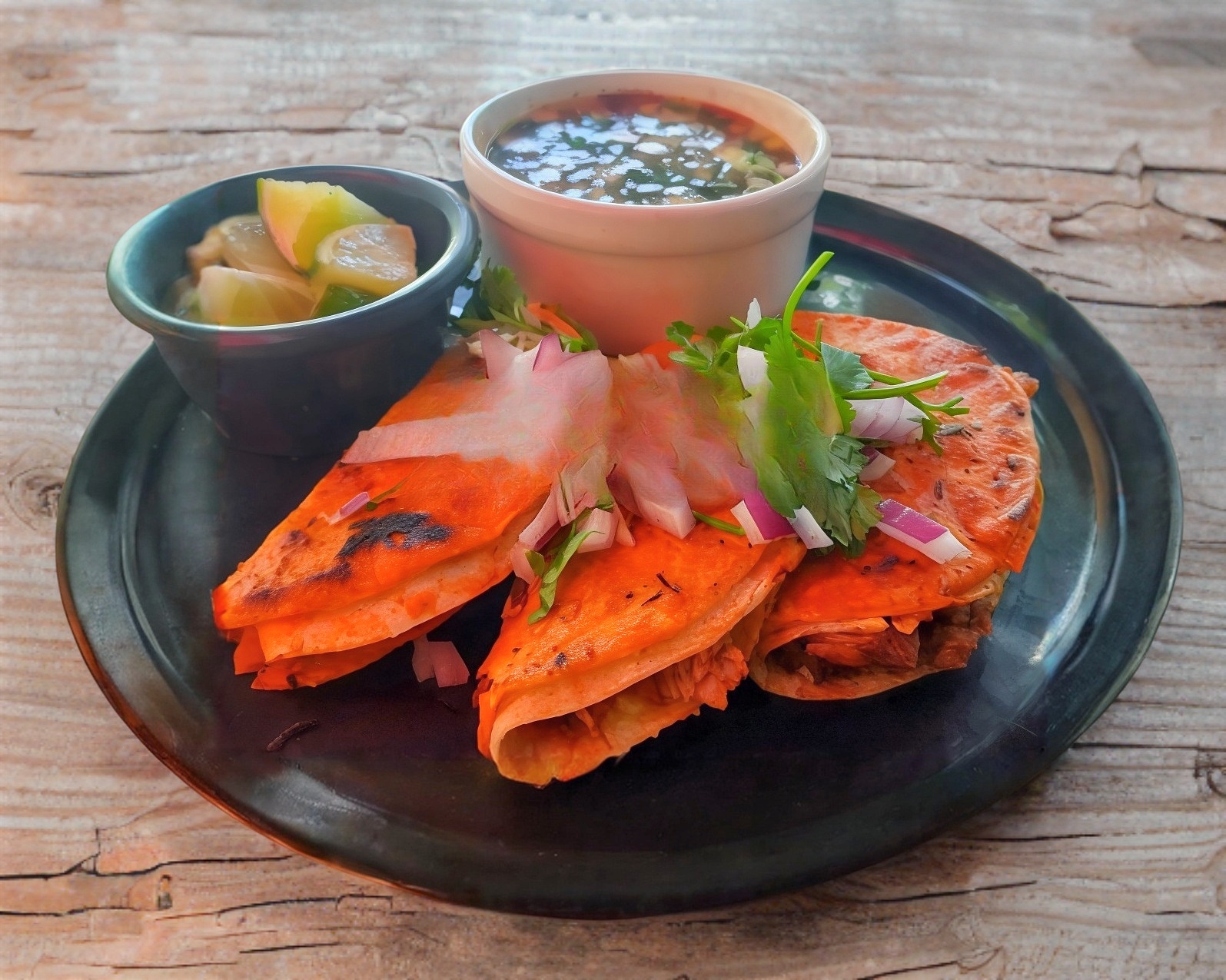 3 Quesabirrias de maíz y 1 consomé chico natural. Acompañado de cebollita con cilantro, salsa verde y limones