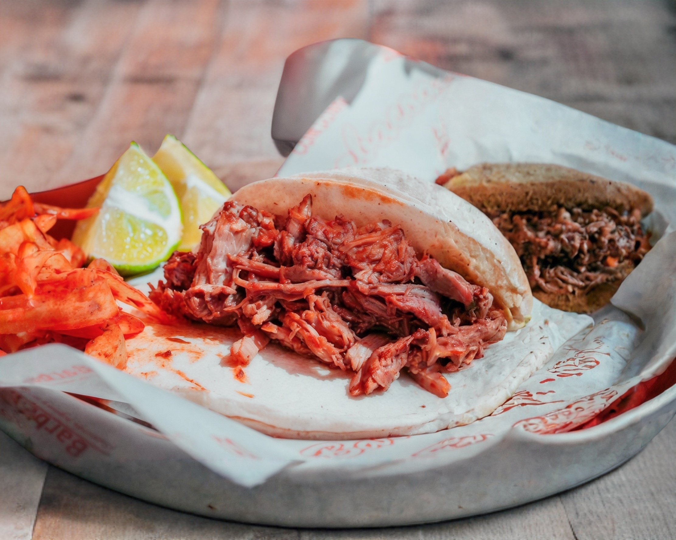 Puré de papa, queso de hebra derretido con barbacoa de la casa, se acompaña con cebollita con cilantro, salsa verde, limones y tortillas.