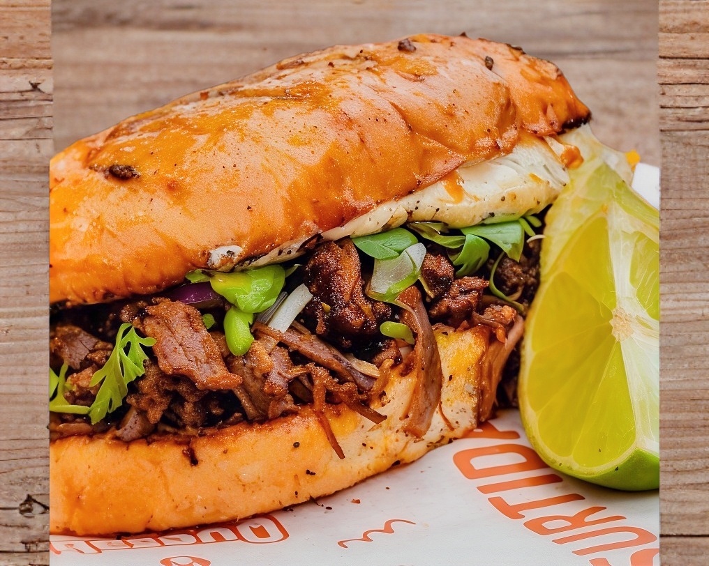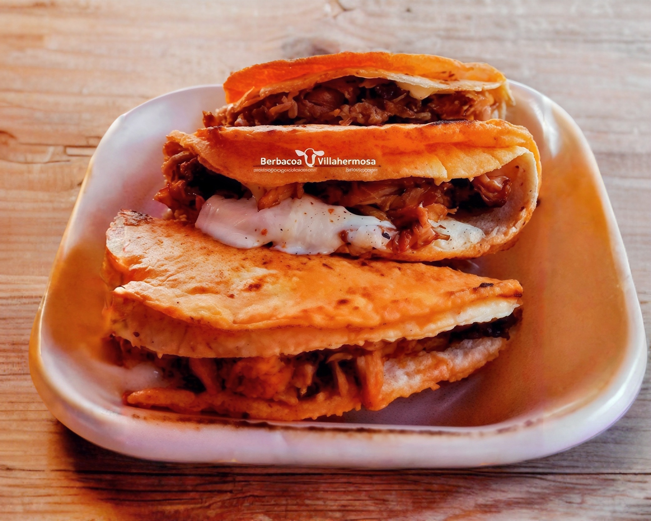 Tortilla de maiz doradita, queso de hebra gratinado y carnita de barbacoa deliciosa