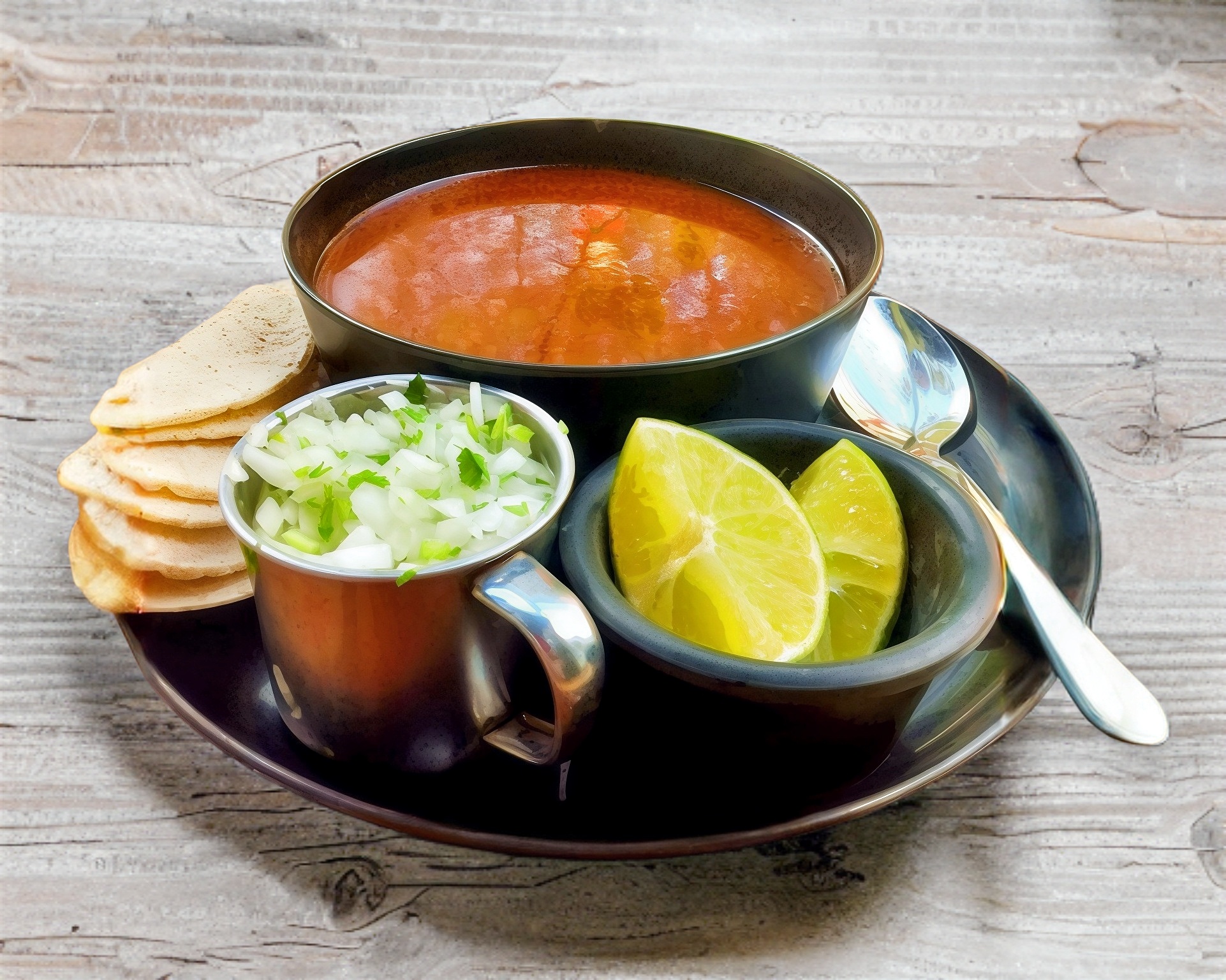 1 L de consomé con carne, incluye: cebollita con cilantro, limones y tortillas