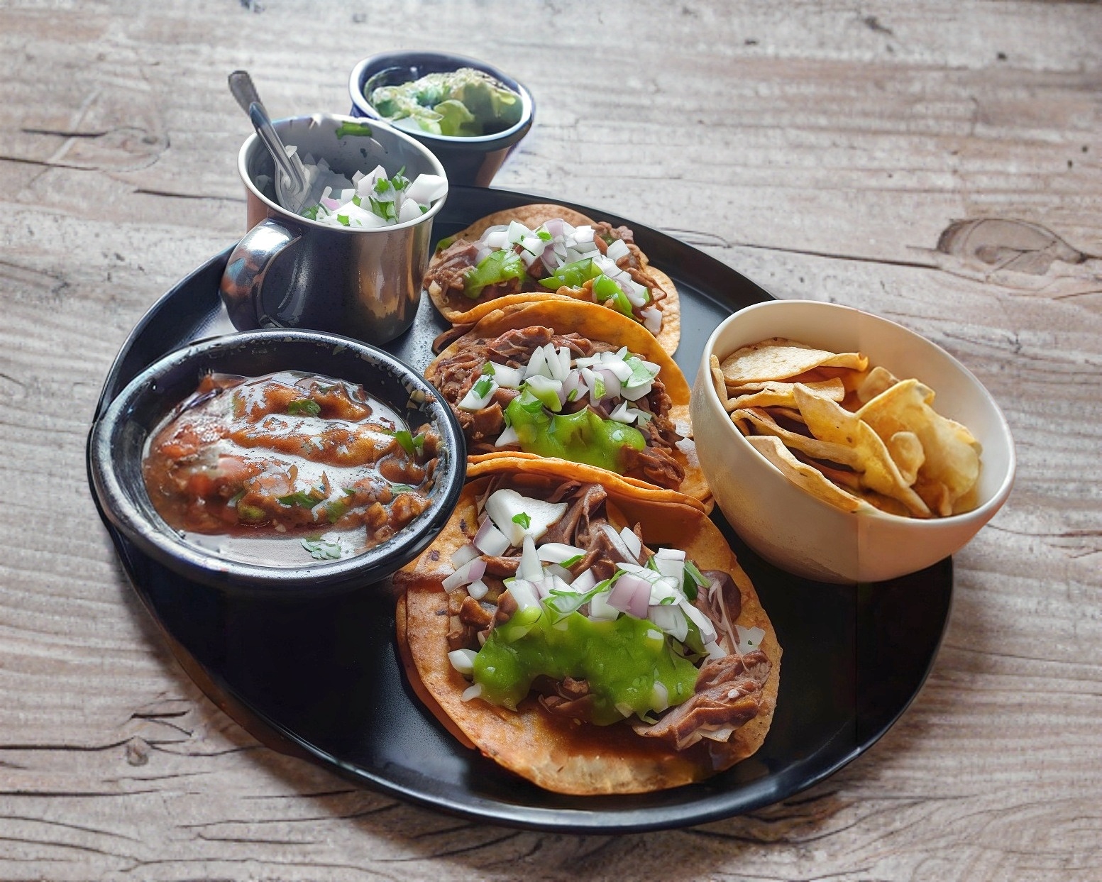 Tortilla de maíz doble, barbacoa y costra de queso. Incluye complementos.