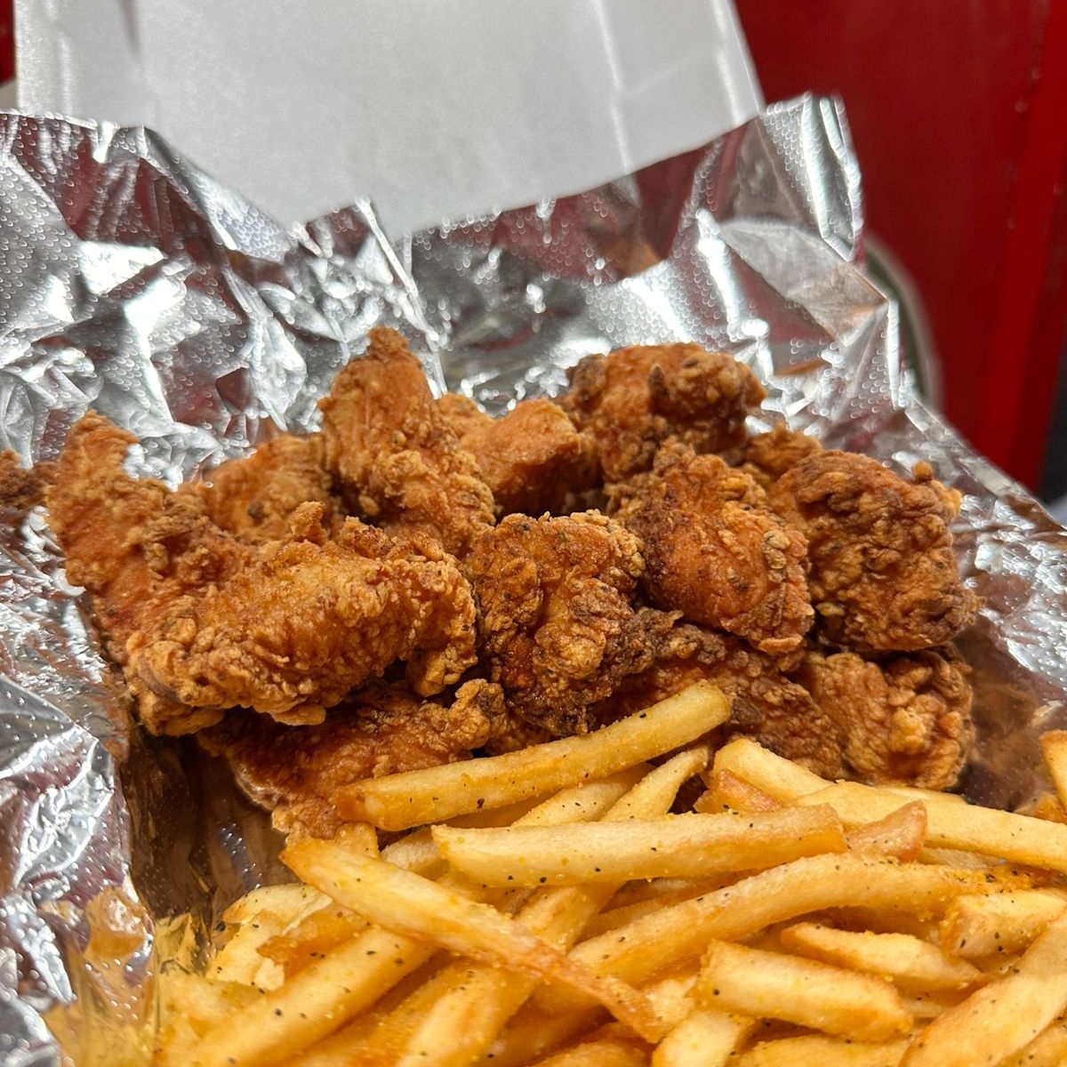 Algo aún mejor que lo especial, algo extra especial, órden de 250 gr de papas gajo, sazonadas con queso suizo gratinado y trocitos de tocino asado con fajitas de pollo de boneless con salsa a elegir, espolvoreado de perejil y acompañado de dip de queso cheddar y cátsup.