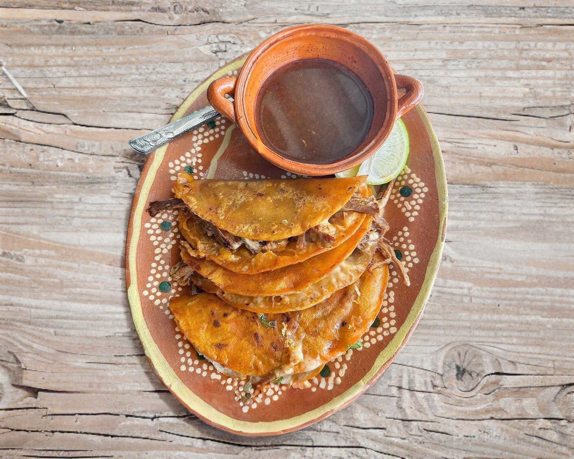3 Quesabirrias (tortilla grande) más consomé natural chico.