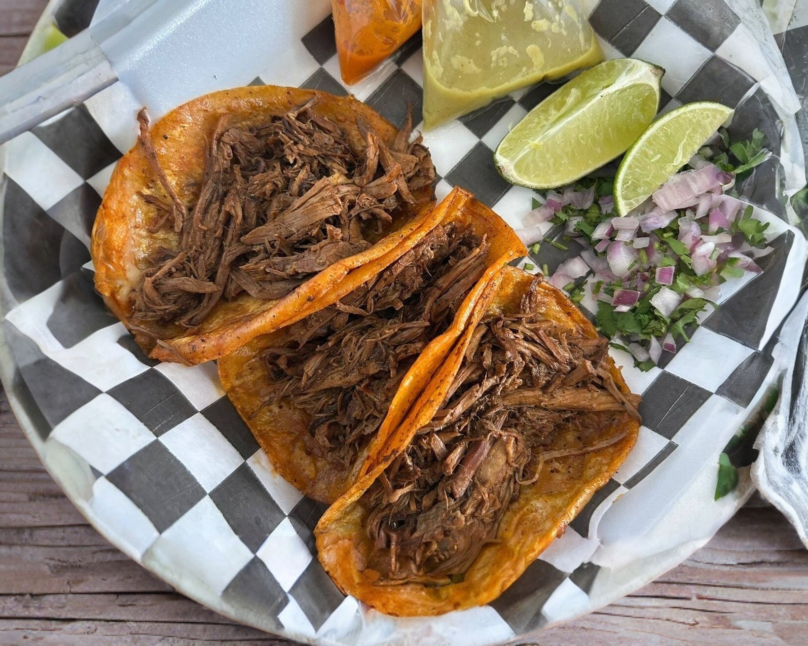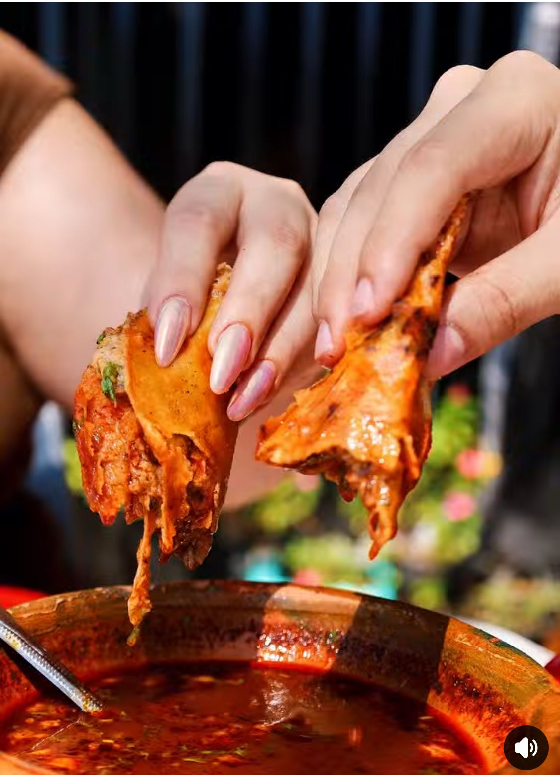 Tortilla de maíz dorada, rellena de birria.