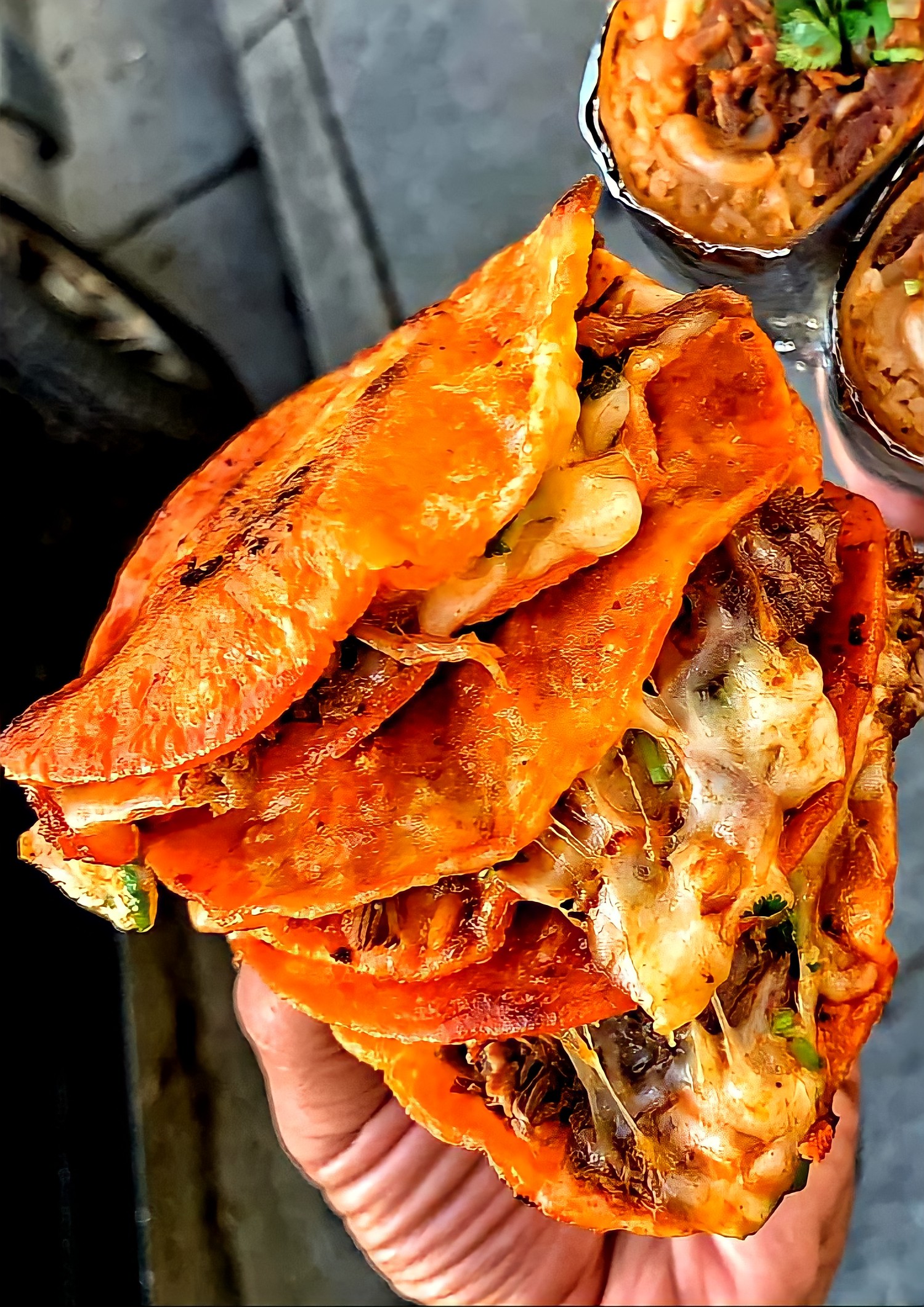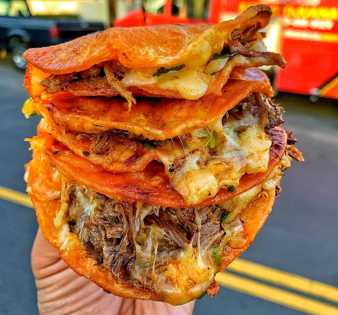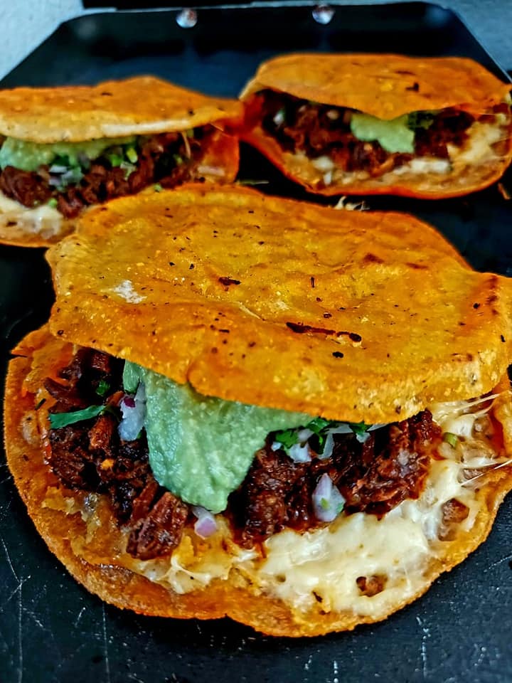 tortilla sazonada 100 % de maíz por arriba y abajo en tipo sincronizada,contiene cilantro,cebolla,carne,queso manchego, guacamole.
