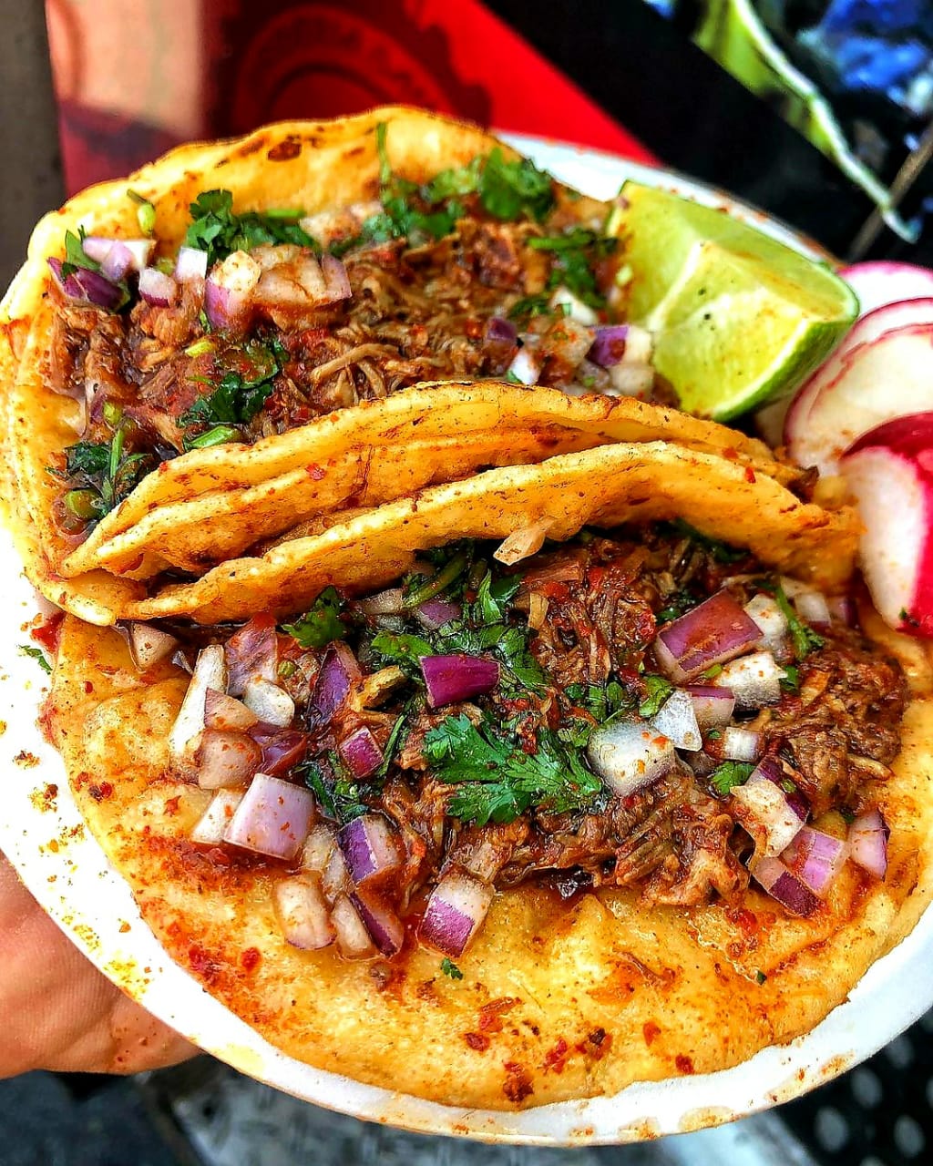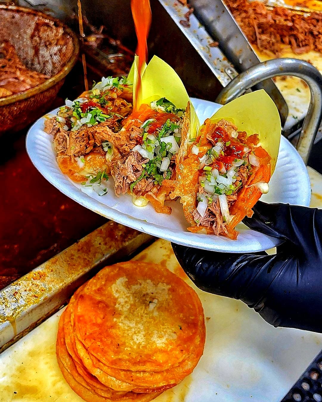 Taco con doble tortilla nixtamalizada y sazonada contiene carne,cilantro,cebolla y queso fundido.