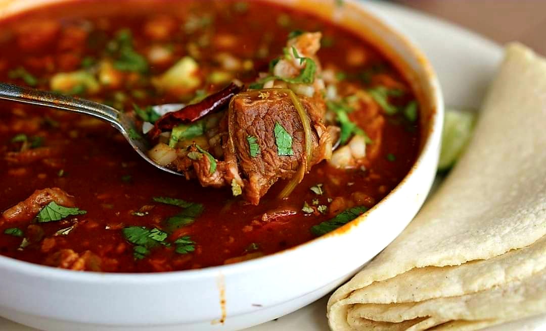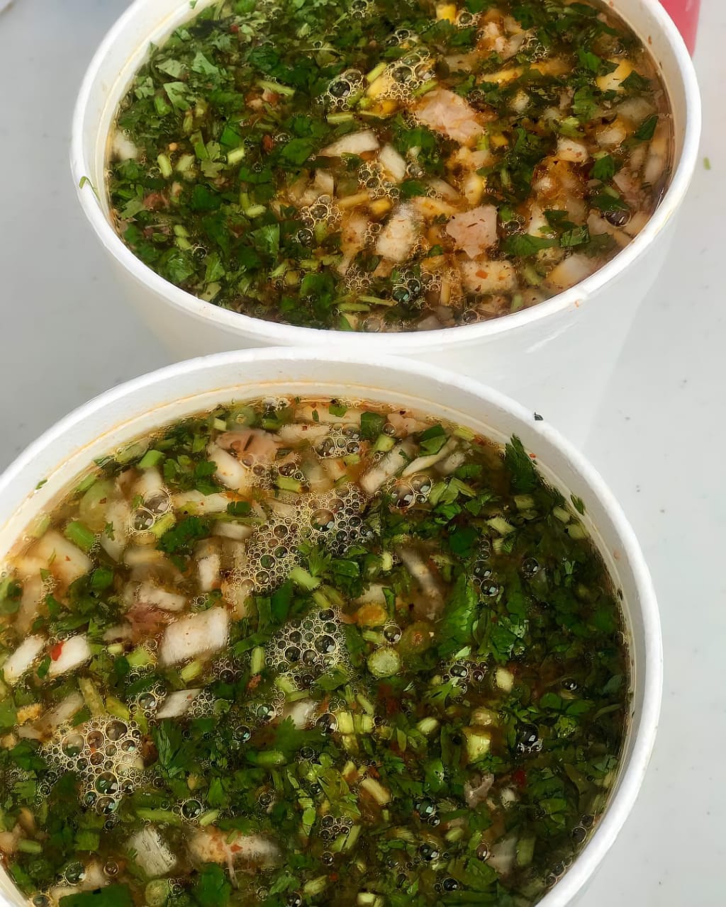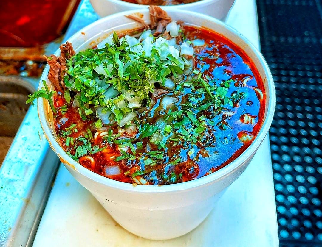 Vaso de 450 ML contiene carne, consome, cilantro y cebolla.