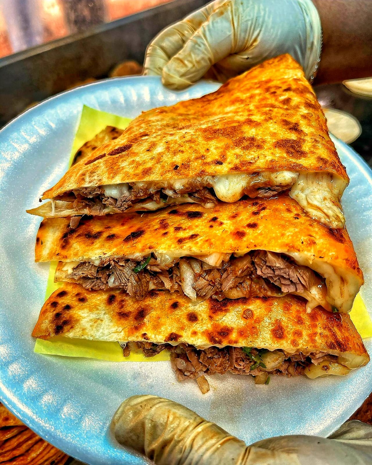 Hecha en tortilla de harina ,queso fundido,carne, cilantro, cebolla INCLUYE UN CHOPERO de 400ml.