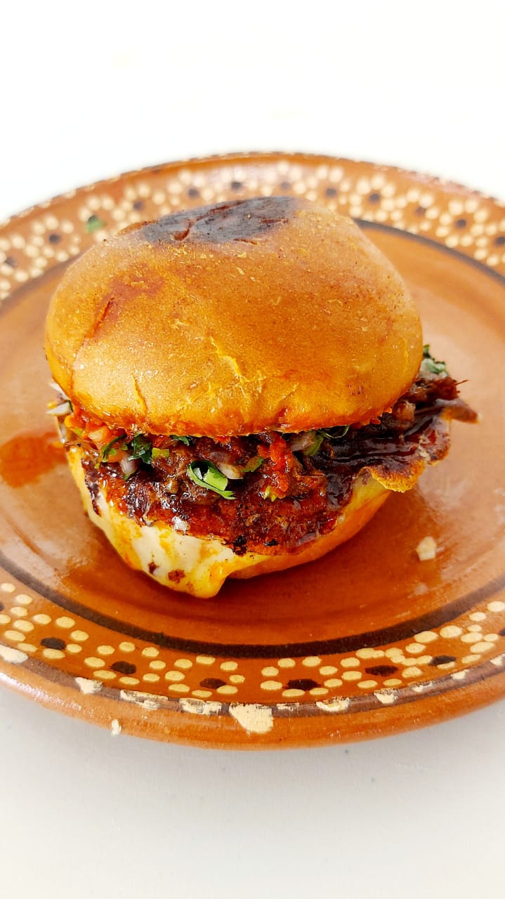 Pan sazonado,con queso fundido a la plancha contiene carne cilantro cebolla y guacamole.
