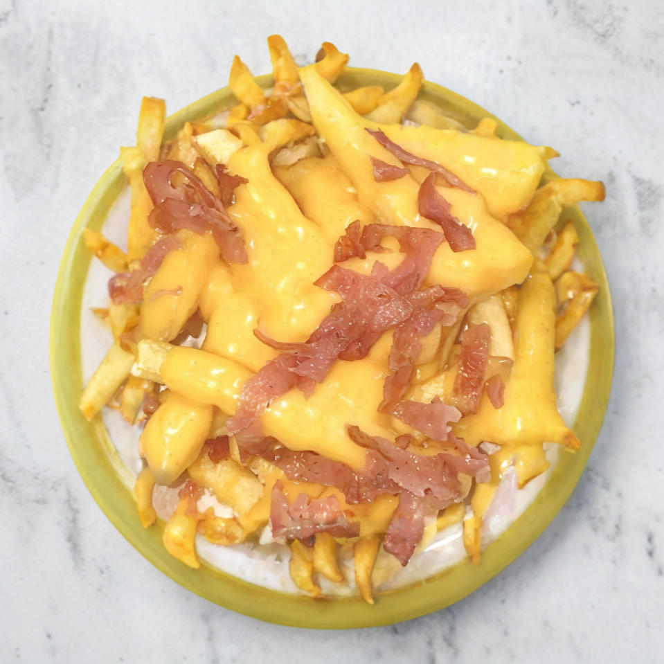 200 grs de papas a la francesa con queso cheddar y trocitos de tocino