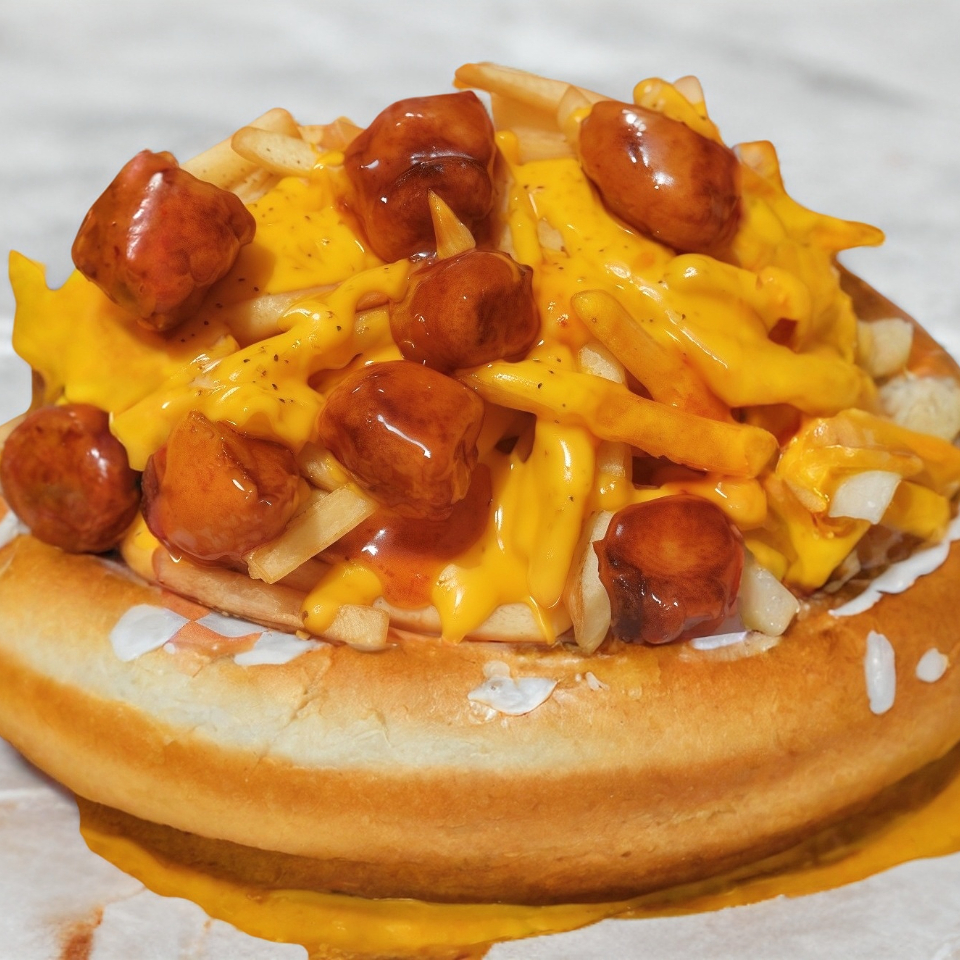 Trocitos de salchicha con papas a la francesa y queso cheddar