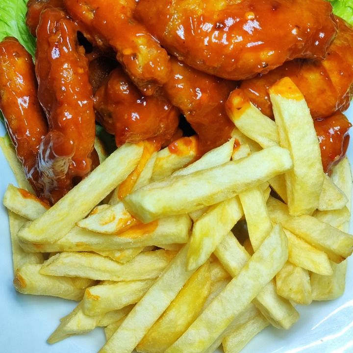 420 grs de deliciosas alitas de pollo bañadas en 2 salsas a elegir acompañadas de aderezo ranch, vegetales y 200 grs de papas a la francesa