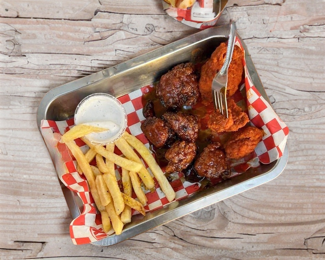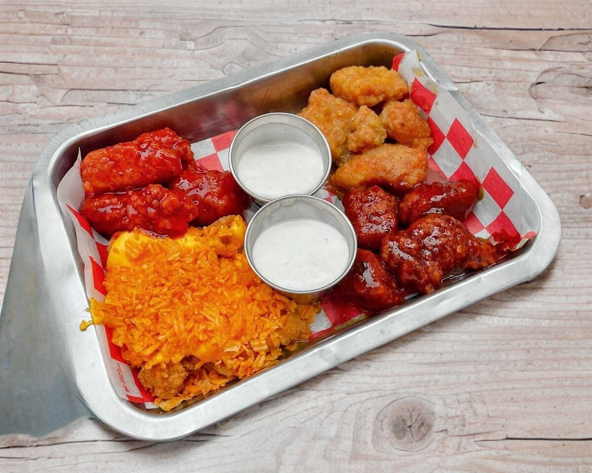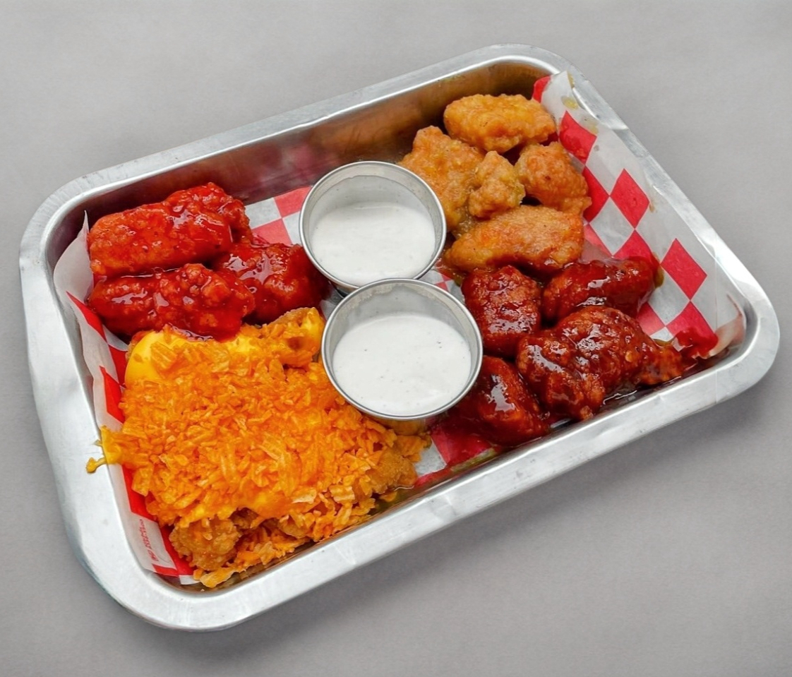200gr palomitas pollo , 100gr papas a la francesa sazonadas con lemon pepper, bañadas en salsa de su preferencia, 1 a escoger, 1 aderezo de blue cheese.