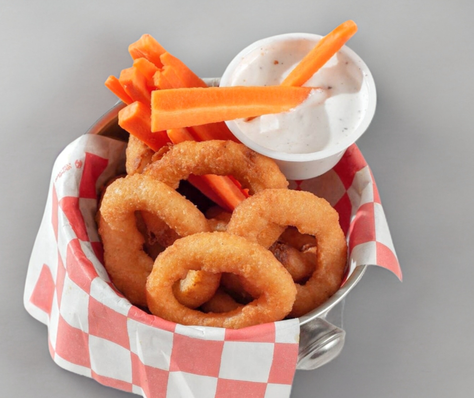 10 PIEZAS DE AROS DE CEBOLLA , ACOMPAÑADOS CON BASTONES DE ZANAHORIA Y ADEREZO DE QUESO AZUL