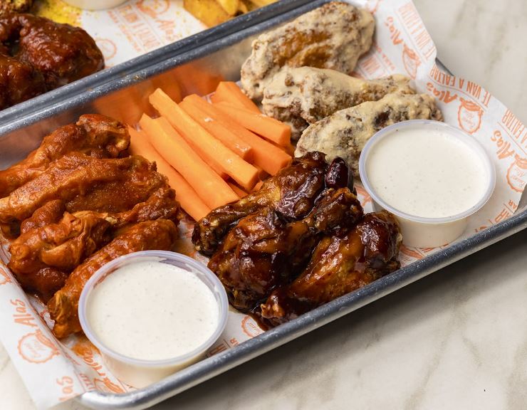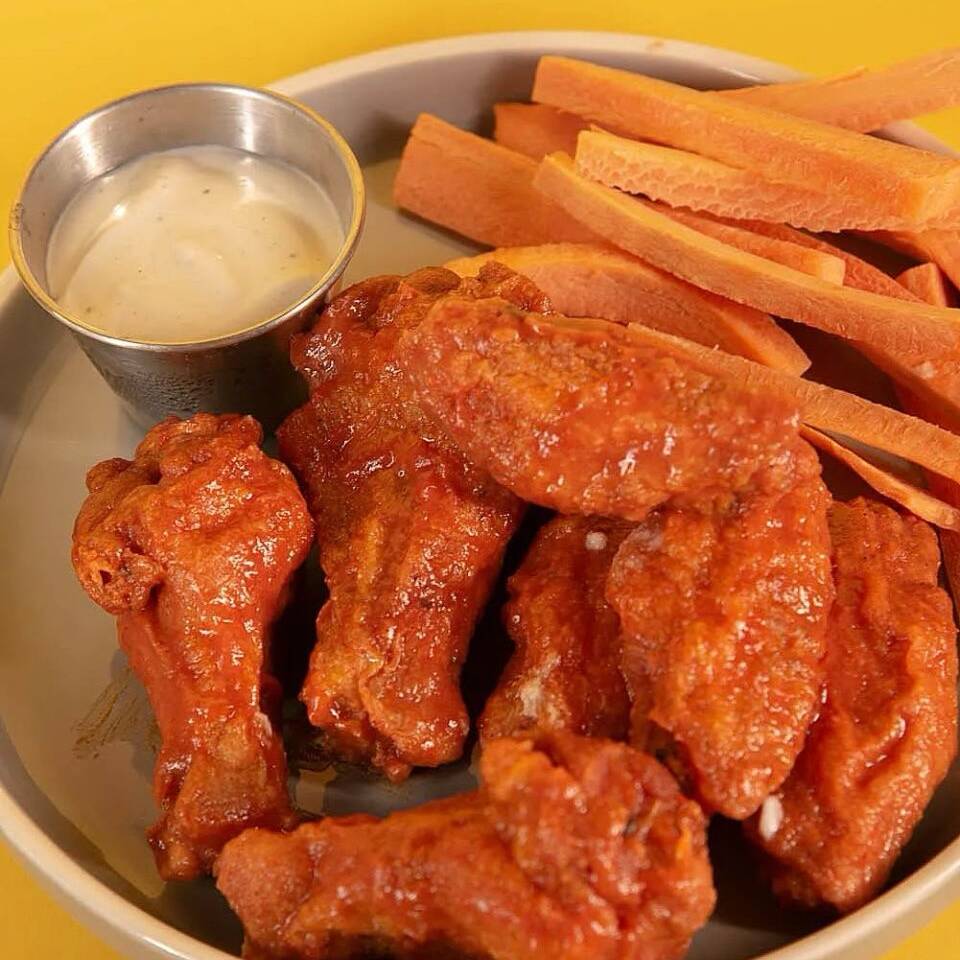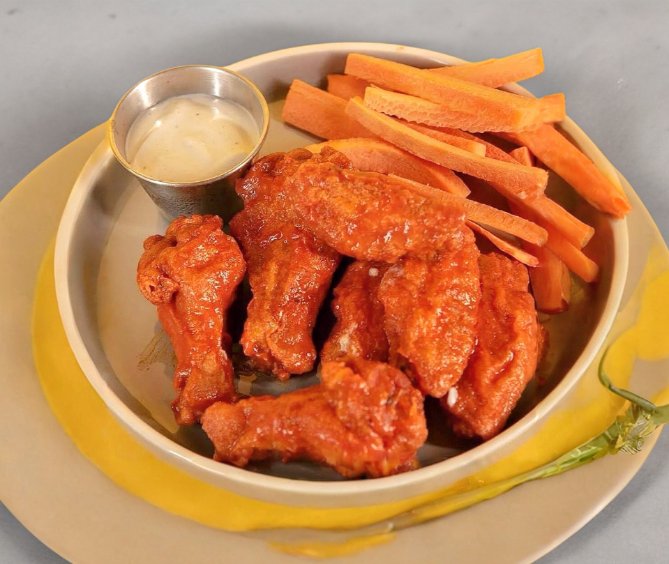 DELICIOSAS ALITAS DE POLLO, BAÑADAS EN TU SALSA FAVORITA, ACOMPAÑADA DE BASTONES DE ZANAHORIA Y ADEREZO DE QUESO AZUL
