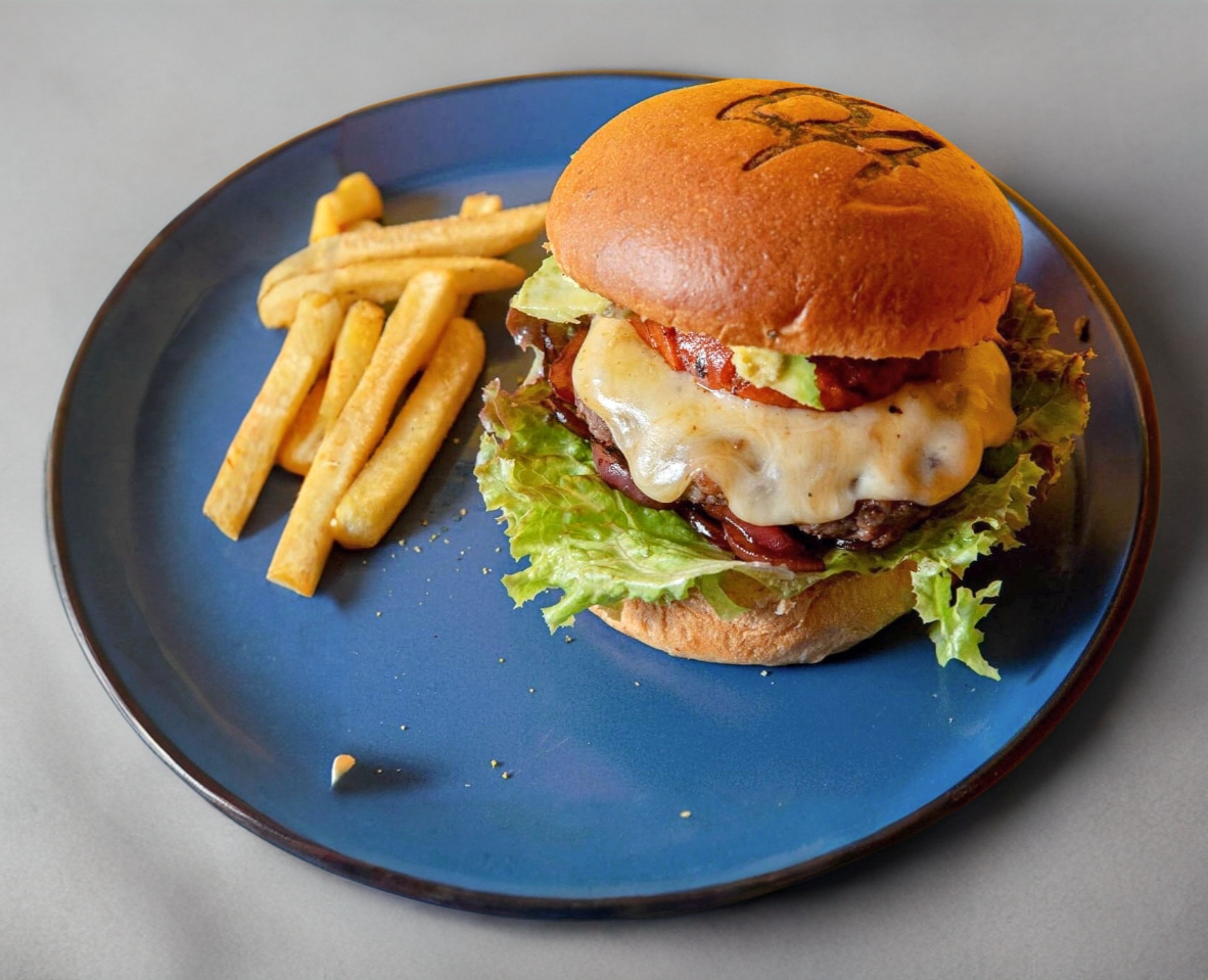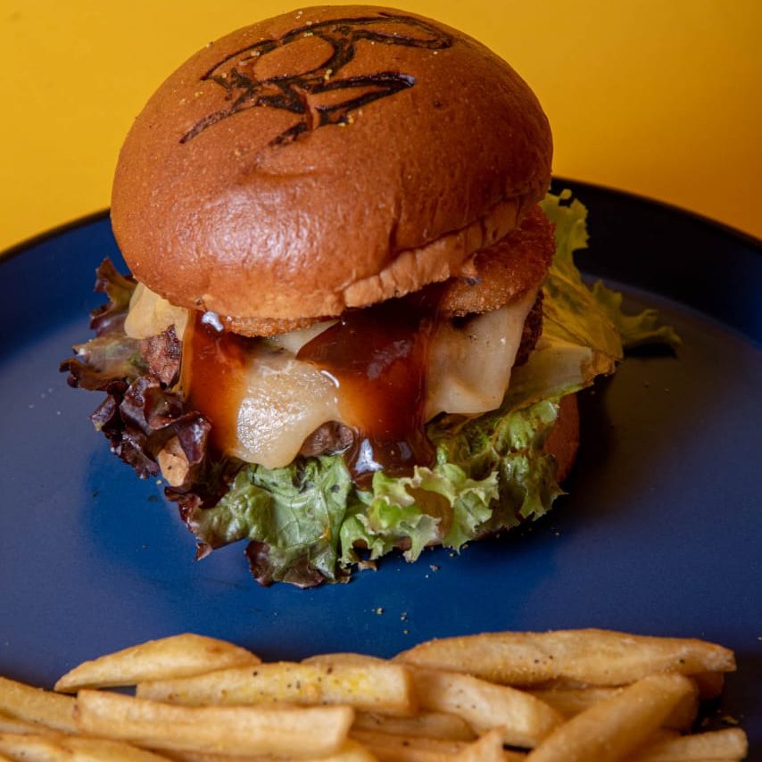 150 GR DE CARNE TOP SIRLOIN, QUESO GOUDA, 2 AROS DE CEBOLLA EMPANIZADOS, BBQ, LECHUGA, TODO DENTRO DE NUESTRO PAN DE PAPA, ACOMPAÑADO DE 100GR DE PAPAS A LA FRANCESA