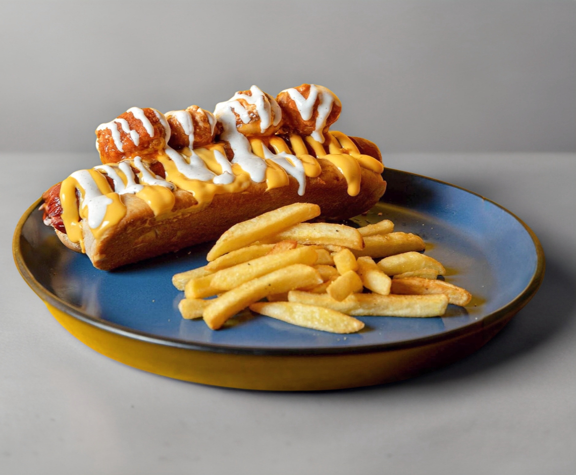 JUSTO LO QUE TE RECETO EL DOCTOR. SALCHICHA 100% DE RES, BONELESS EN SALSA BUFFALO, QUESO AMARILLO, ADEREO DE QUESO AZUL, PAN ARTESANAL, ACOMPAÑADO DE 100 GR DE PAPAS A LA FRANCESA
