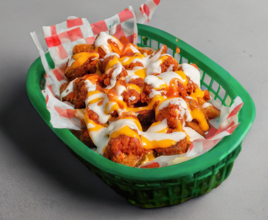 300 GR DE PAPAS GAJO, ACOMPAÑADAS DE 100 GR DE BONELESS DE POLLO BAÑADOS EN SALSA BUFFALO, ADEREZO DE QUESO AZUL Y QUESO AMARILLO