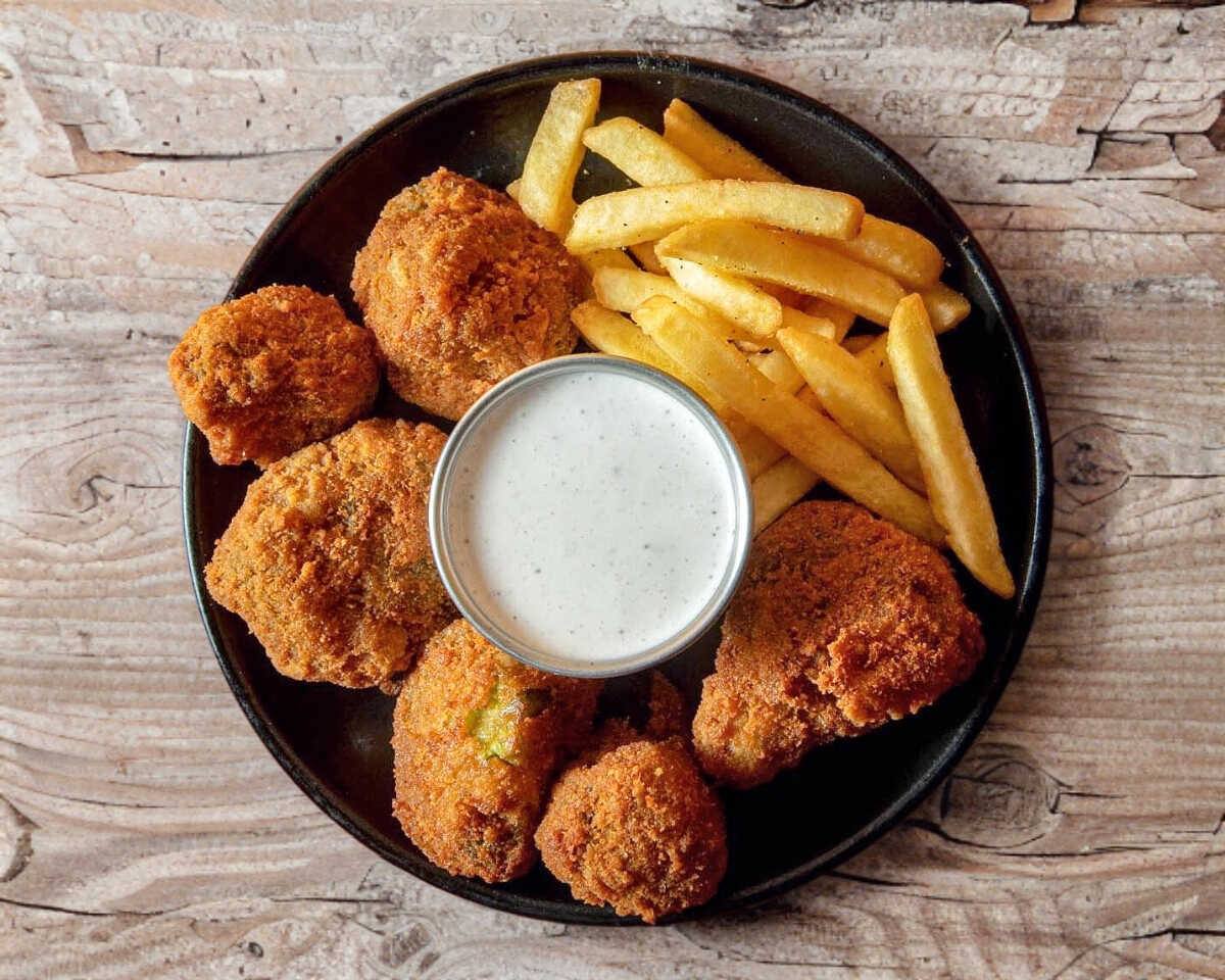 TROCITOS DE BROCOLI EMPANIZADO, BAÑADOS EN TU SALSA FAVORITA, ACOMPAÑADOS DE 300 GR DE PAPAS A LA FRANCESA Y ADEREZO DE QUESO AZUL