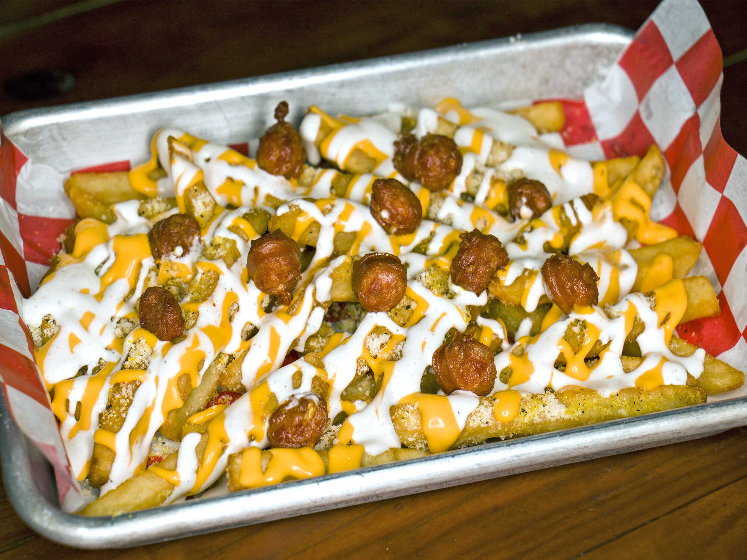 300 GR DE PAPAS A LA FRANCESA, SAZONADAS CON LEMON PEPPER, CHISTORRA, ADEREZO DE QUESO AZUL, QUESO AMARILLO Y PARMESANO
