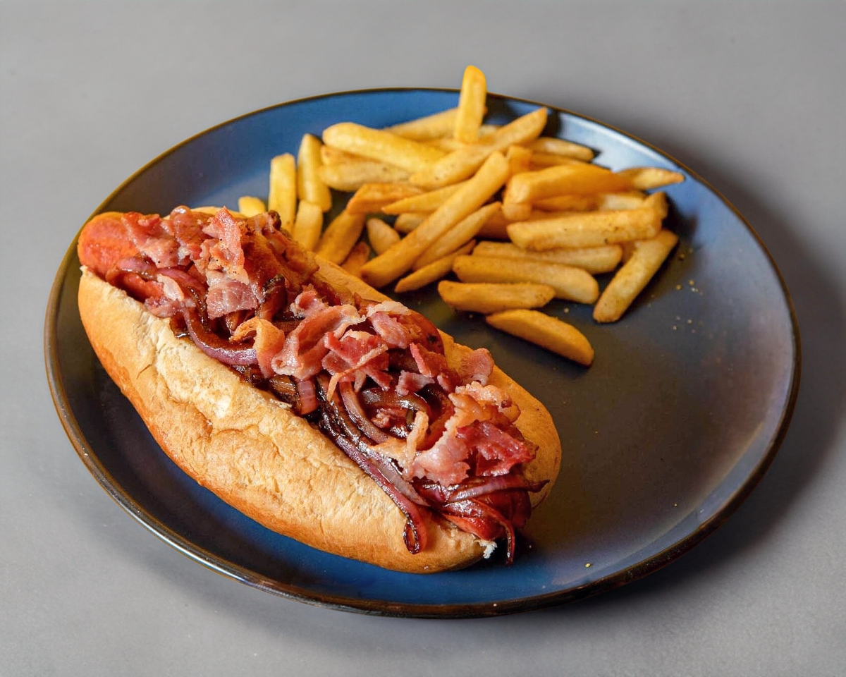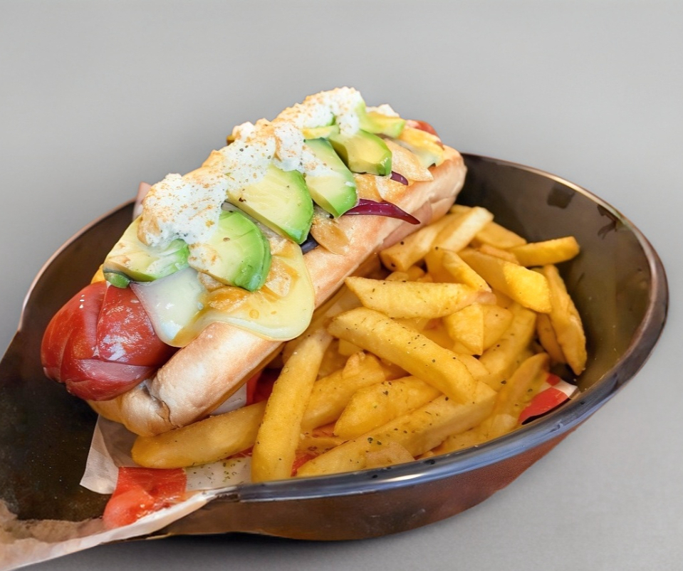 SALCHICHA 100% DE RES, QUESO GOUDA, CEBOLLA CARAMELIZADA, CHORIZO, SALSA AJO/HABANERO, PAN ARTESANAL, ACOMPAÑADO DE 100 GR DE PAPAS A LA FRANCESA