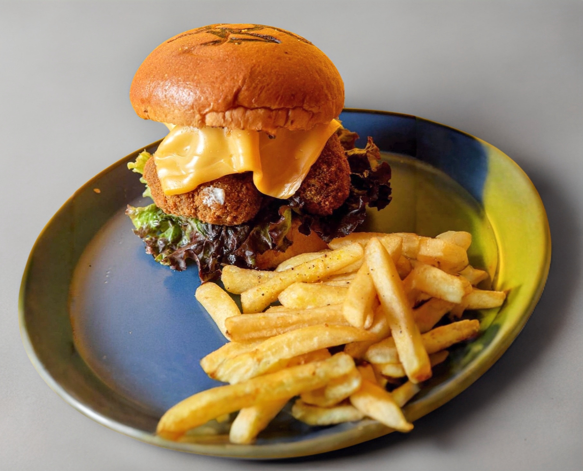 TROCITOS DE BROCOLI EMPANIZADO, BAÑADOS EN TU SALSA FAVORITA, QUESO AMARILLO, TOMATE, CEBOLLA, LECHUGA, TODO DENTRO DE NUESTRO PAN ARTESANAL, ACOMPAÑADO DE 100GR DE PAPAS A LA FRANCESA